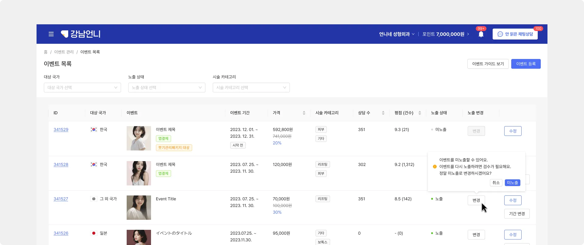 미노출 : 강남언니 앱에 이벤트가 라이브되지 않고 있는 상태