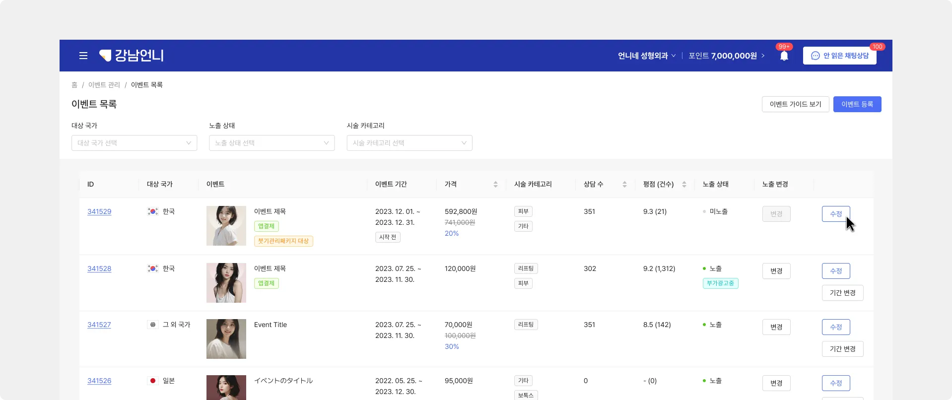 노출 : 강남언니 앱에 이벤트가 라이브되는 상태