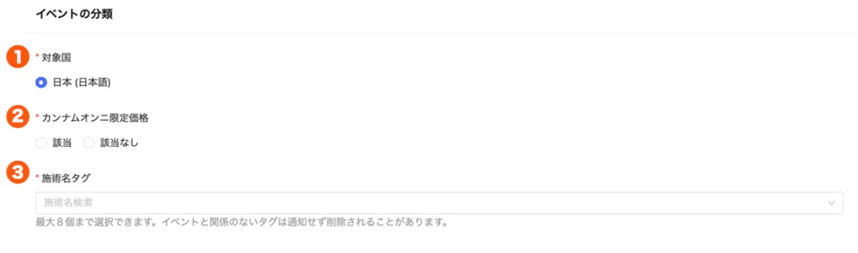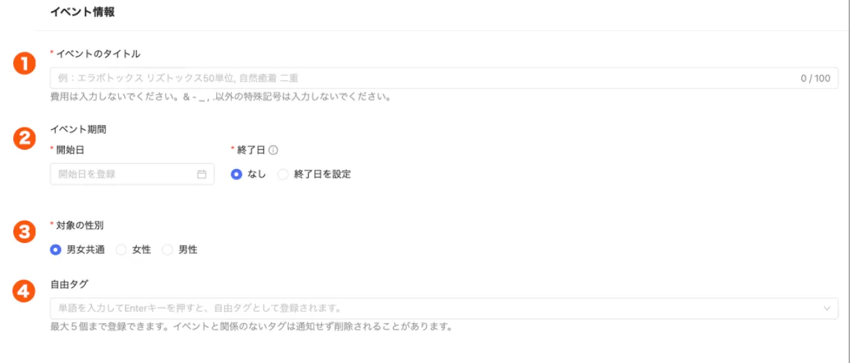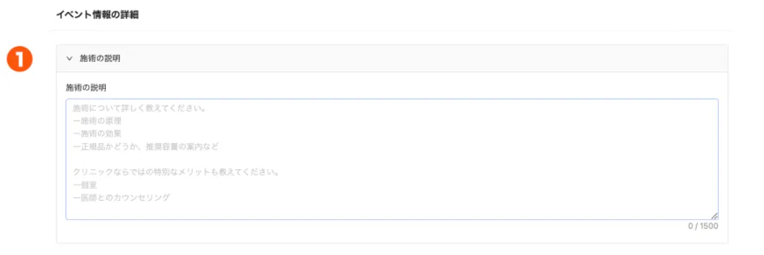 ①施術の説明:イベント内容に加え、注意事項、利用条件、別途かかる費用、施術対象部位、モニター条件などを入力します。