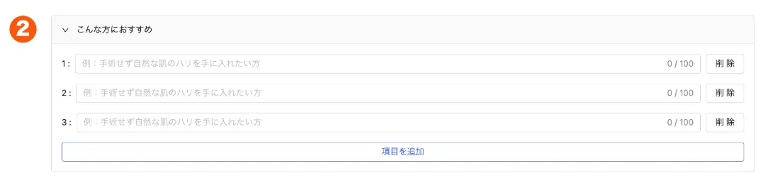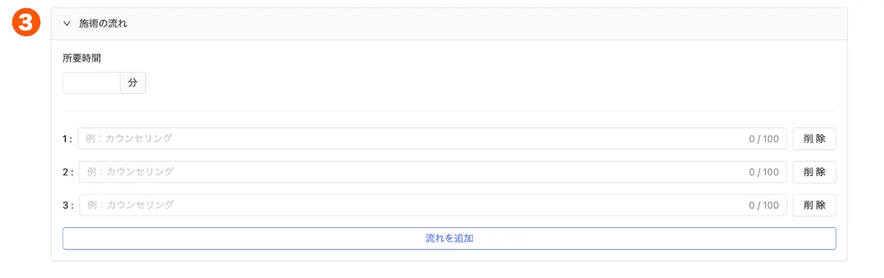 ③施術の流れ:施術の流れを入力いただくと、よりイメージがつきやすいです。(最大10個)