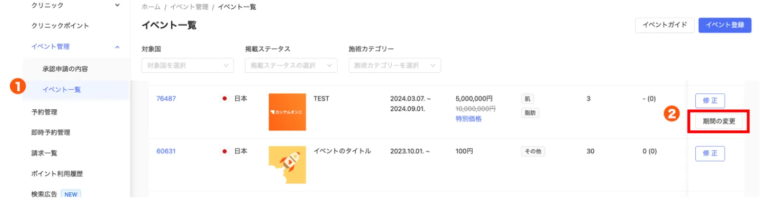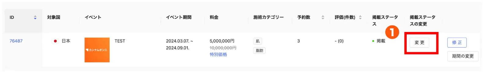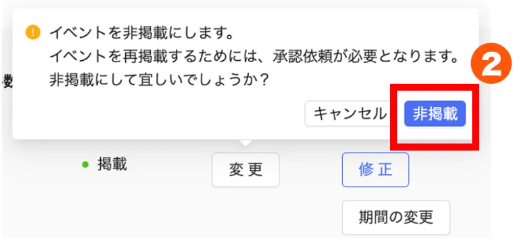 ①非公開にしたいイベントの掲載ステータス変更を押下ください