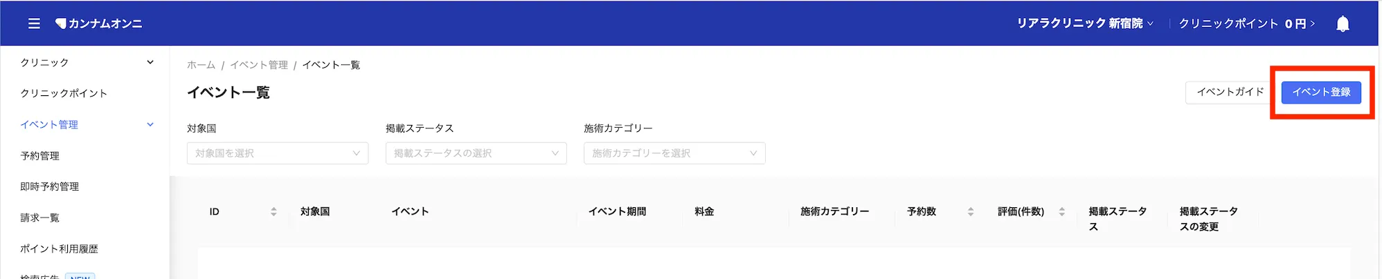 イベント一覧右上にあるイベント登録ボタンをクリックしてください。