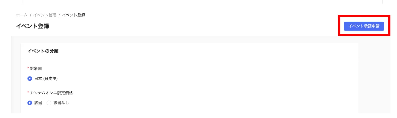 全ての入力が完了したら画面右上のイベント承認申請 ボタンを押下ください。