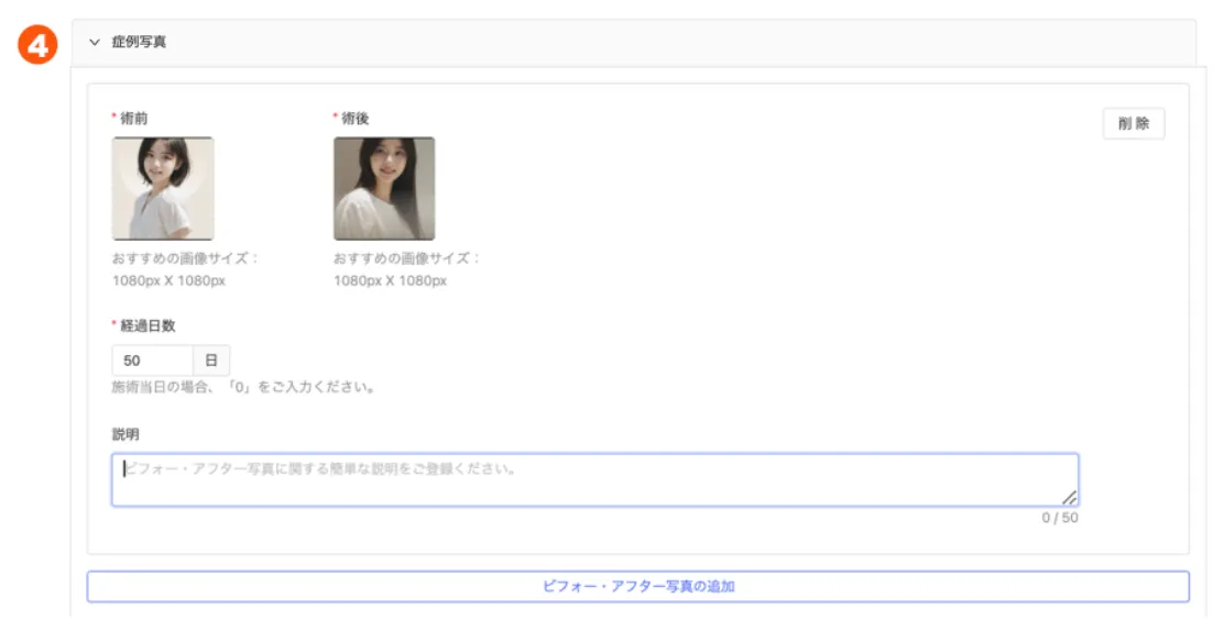 施術を受ける前と後の写真をアップロードし、説明部分には治療内容、治療期間・回数を詳しくご記入ください。