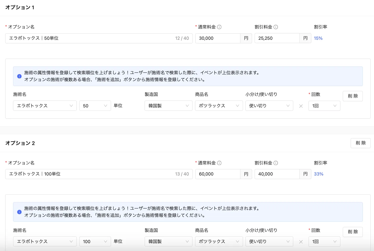 ※オプションに入力する施術としてはタイトルと、利用条件・施術タグ・症例・口コミ内容が共通で設定されても支障がないメニューであることが前提です。
