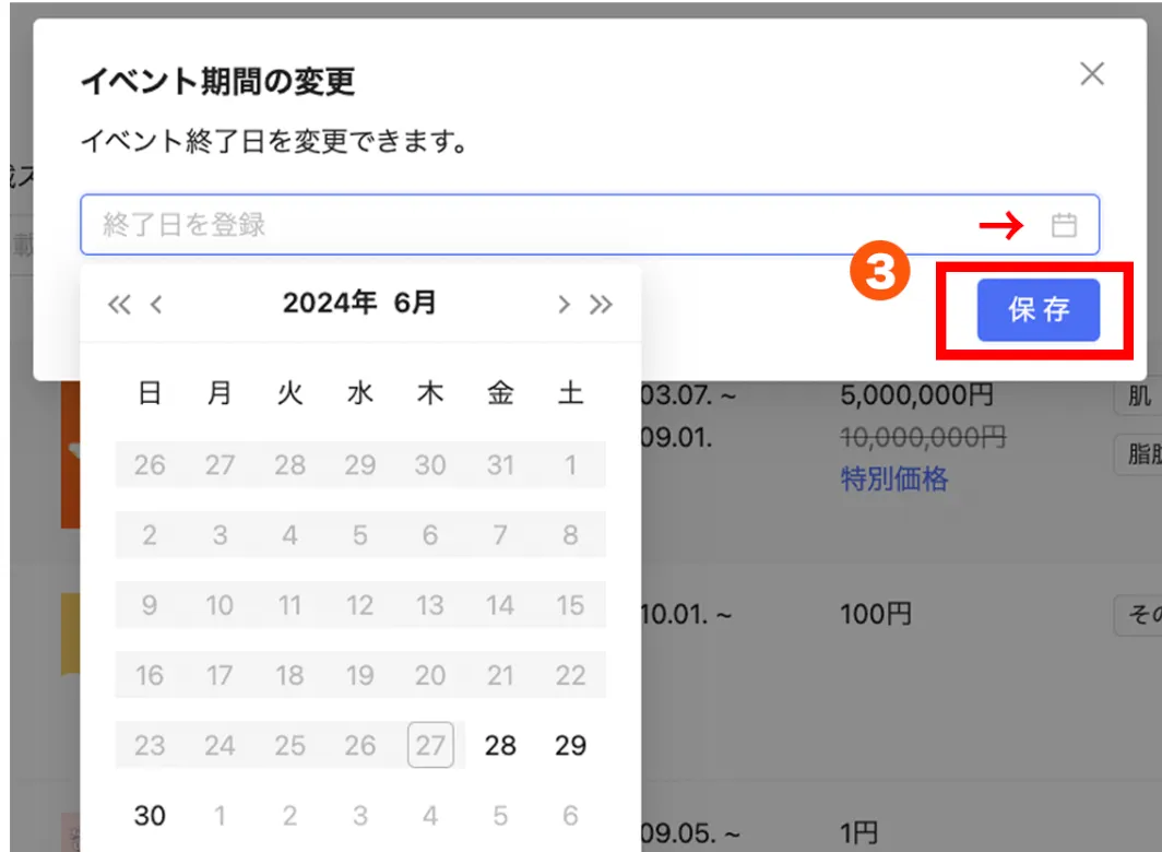 ③イベント終了日を選択カレンダーより設定し、保存 ボタンを押下ください