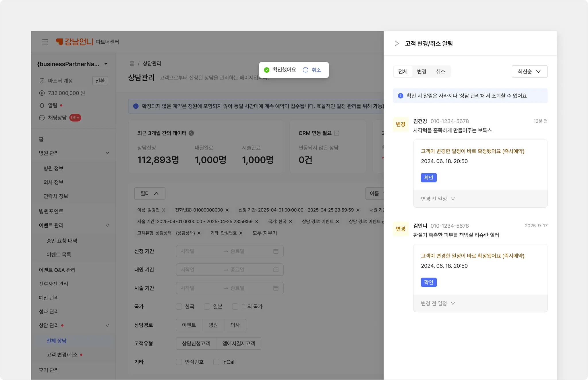만약 고객이 병원에 직접 취소를 요청한다면, 소통 후 파트너센터에서 취소 처리해 주세요.