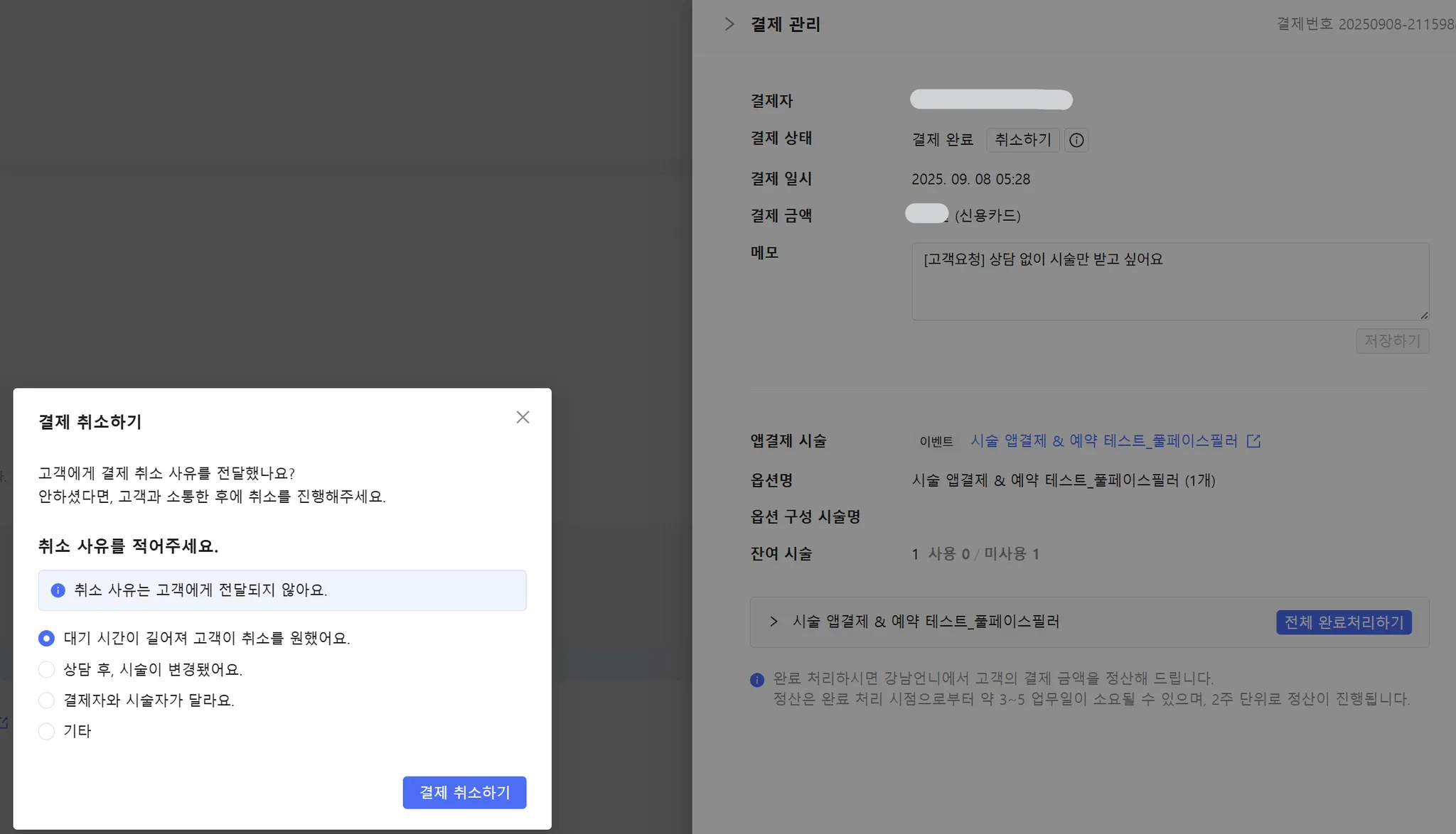 시술 완료 처리 취소 및 완료 처리된 앱결제의 환불 방법