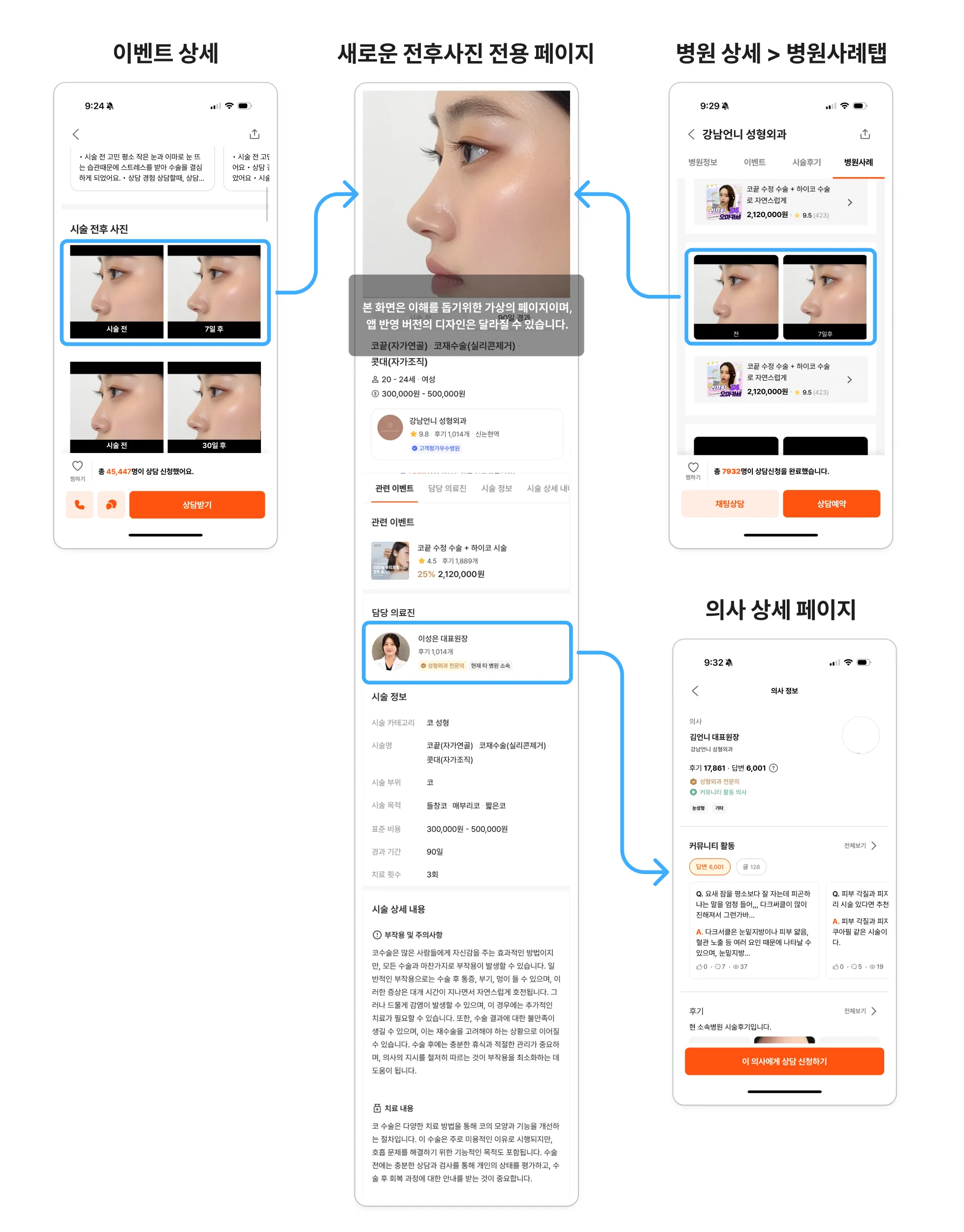병원 페이지 > 병원사례 탭 > 전후사진 클릭 > 새로운 전후사진 전용페이지로 진입