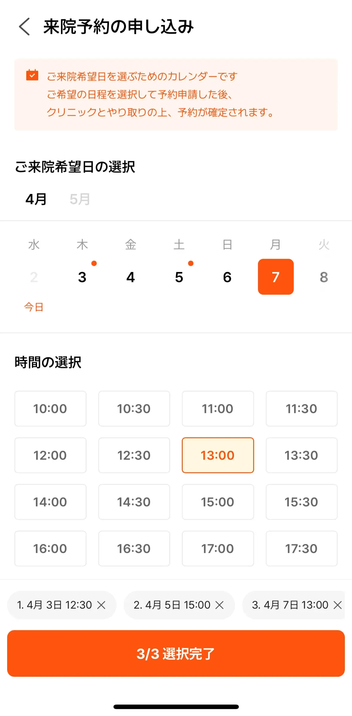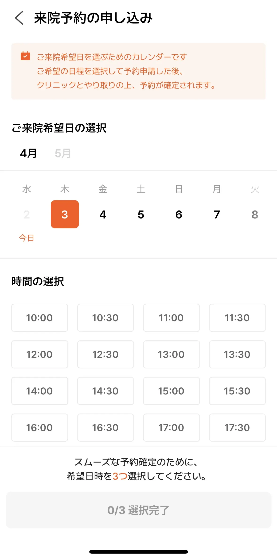 ユーザーはあらかじめ複数の来院希望日を提示できるため、クリニック側での調整がしやすくなり、予約確定までがスムーズになることが想定されます。