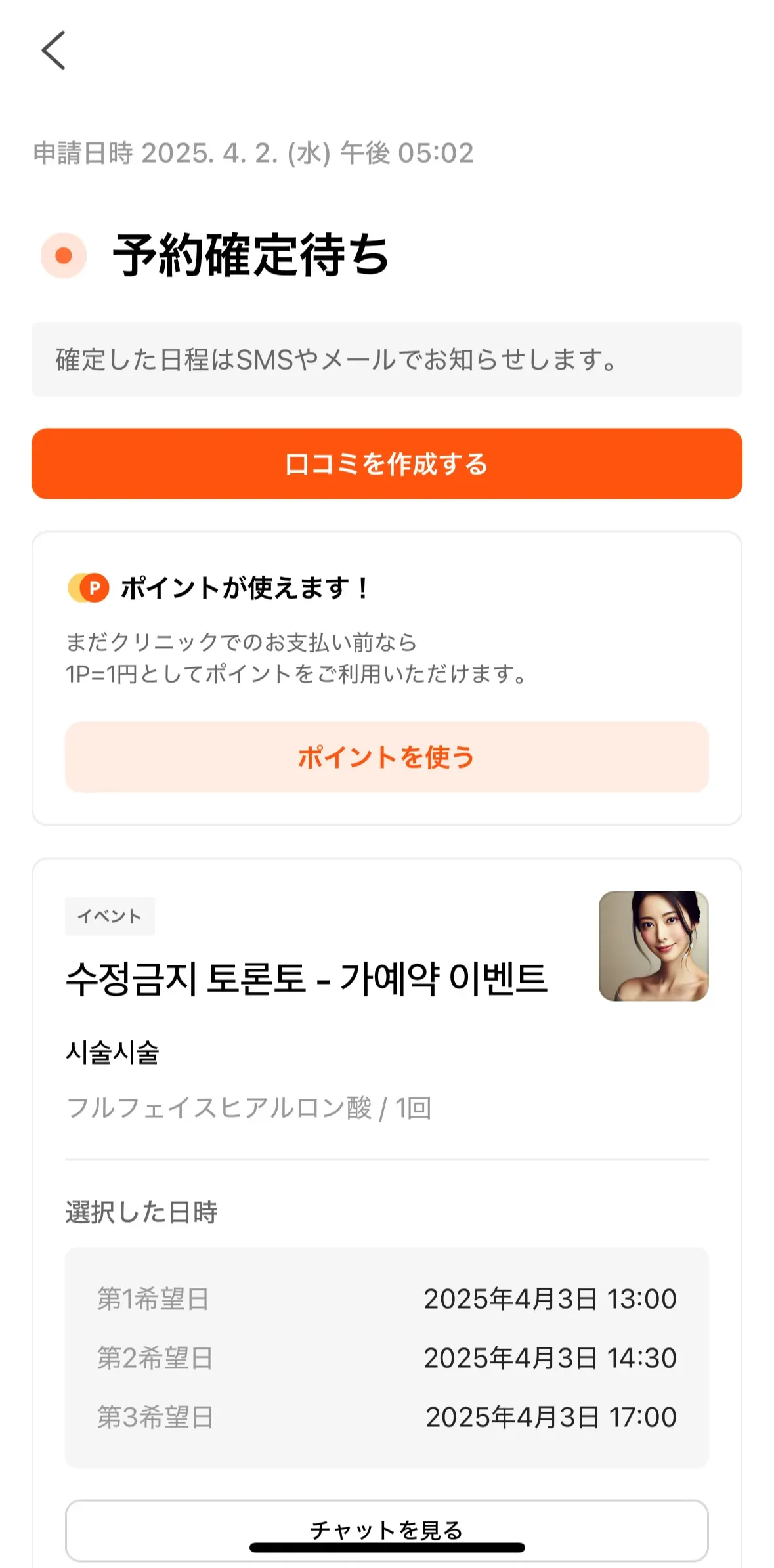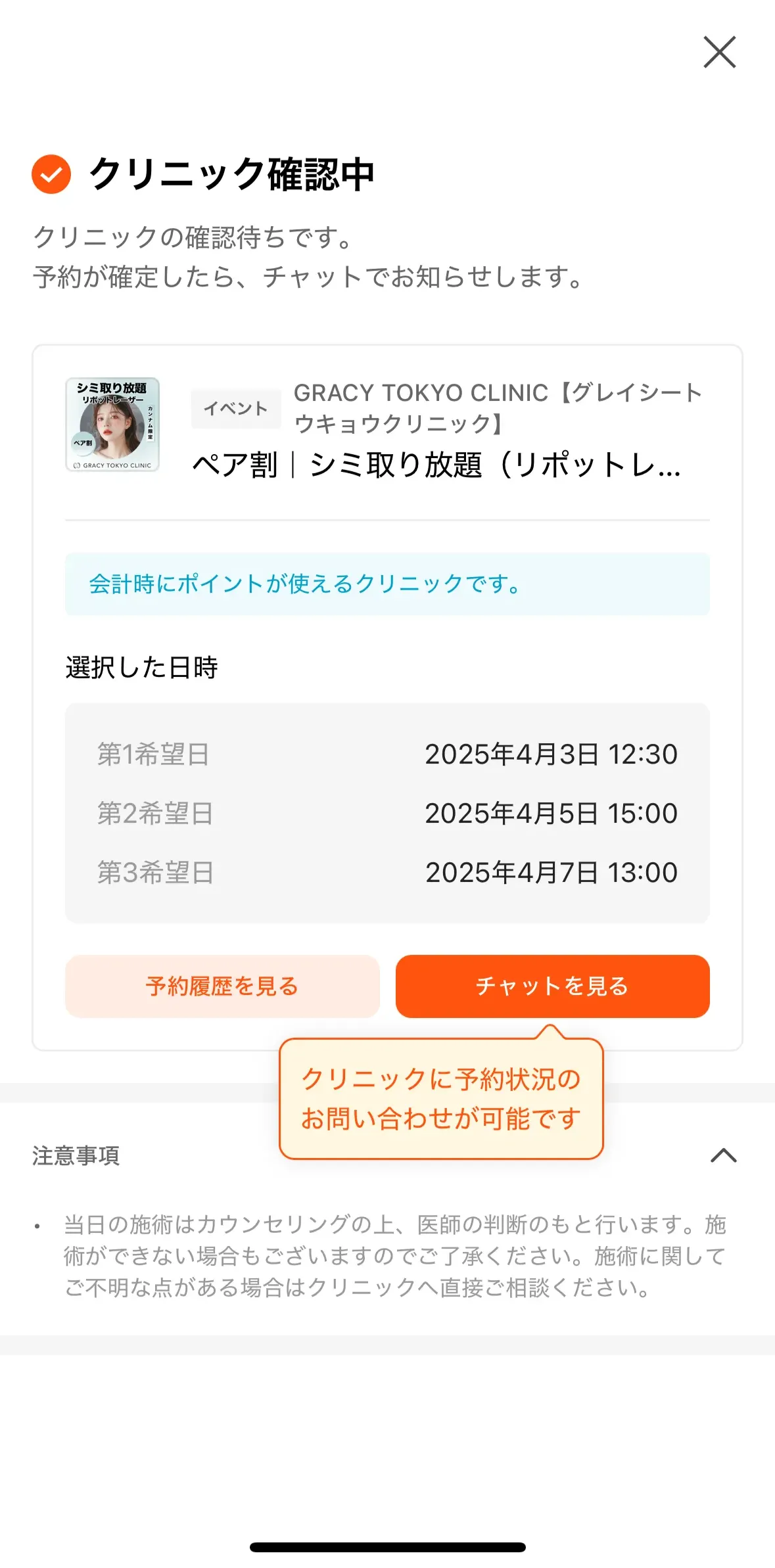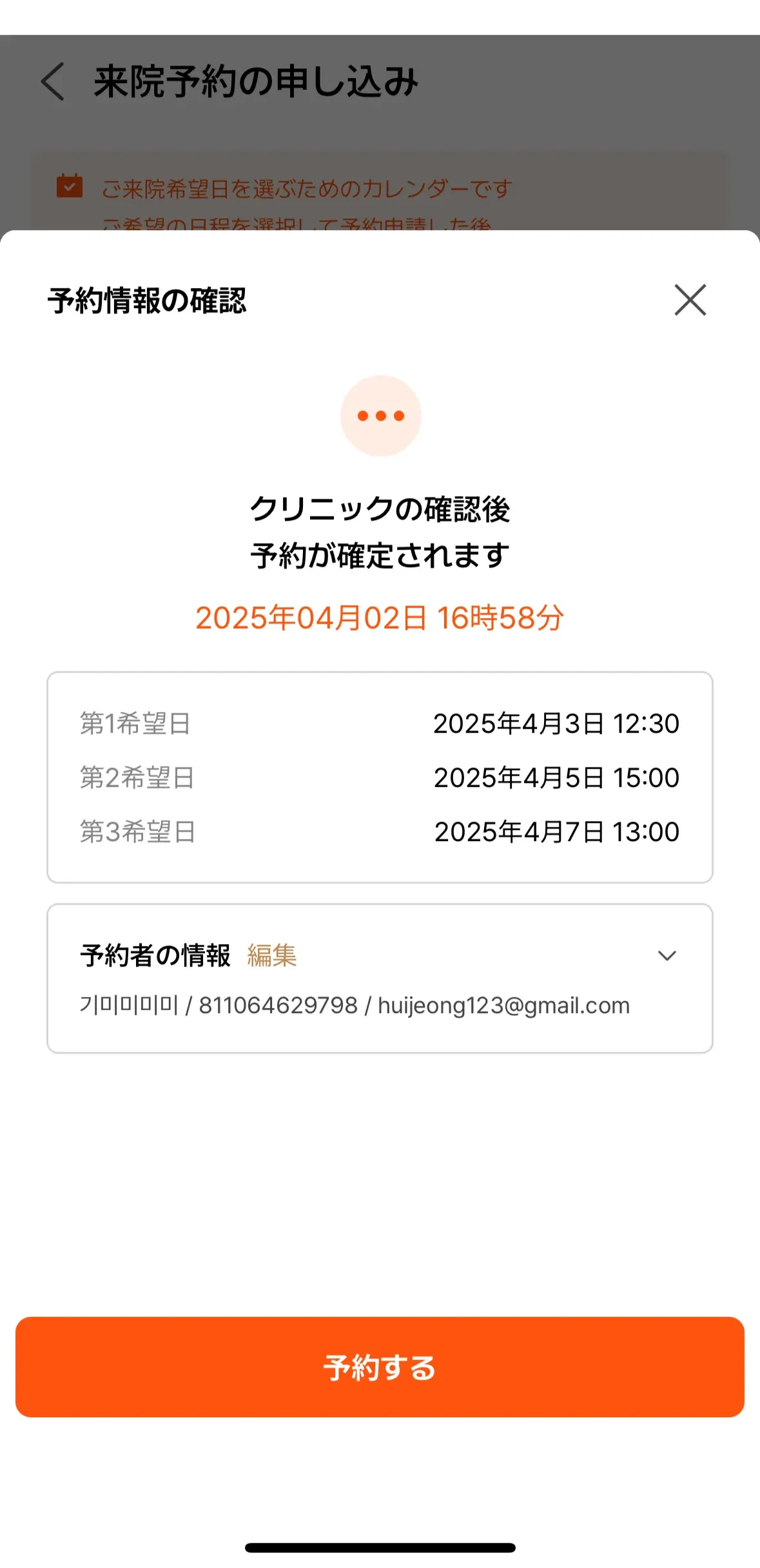 予約情報を確認し予約するをタップ、選択した3つの日程がクリニックに仮予約として送信される