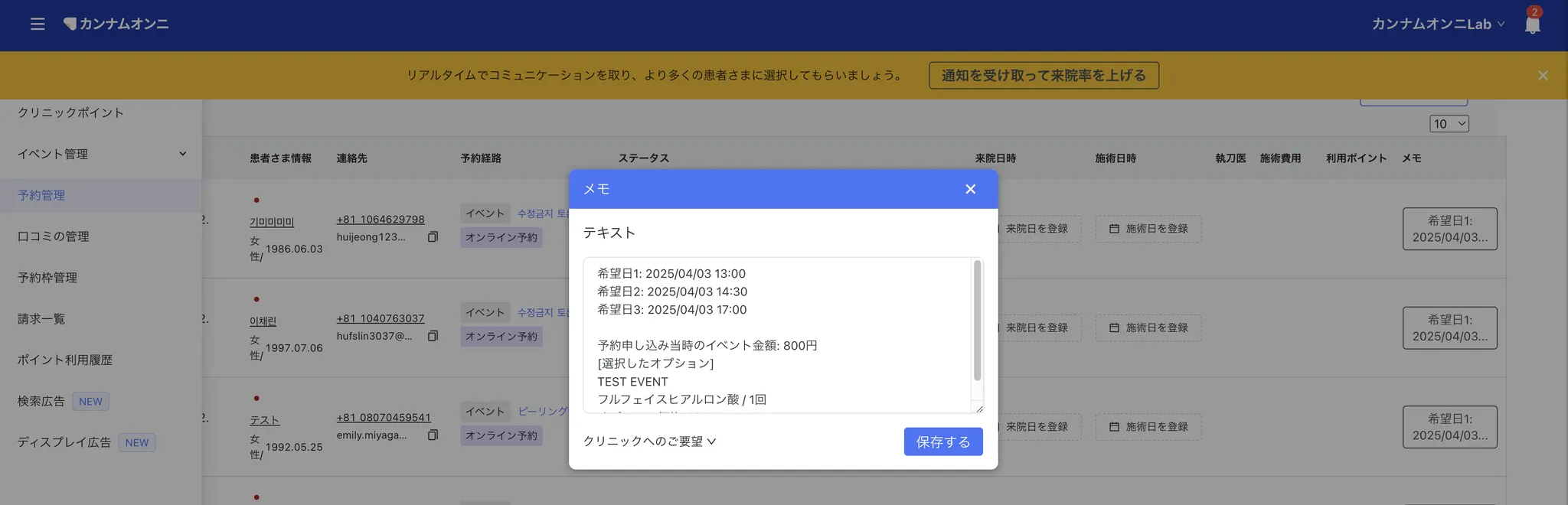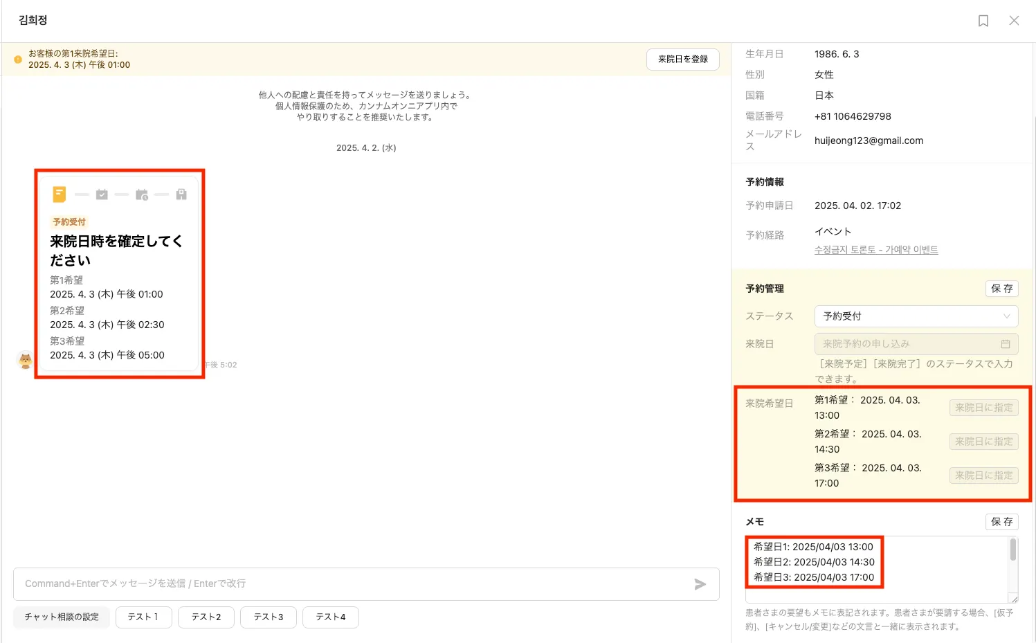 管理画面でユーザーが選択した3つの来院希望日を確認する方法