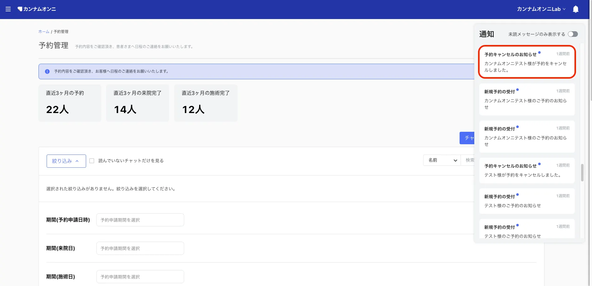 管理画面上で通知を確認後、該当ユーザーの予約ステータスを確認の上、クリニック予約台帳に反映いただくようお願いいたします。