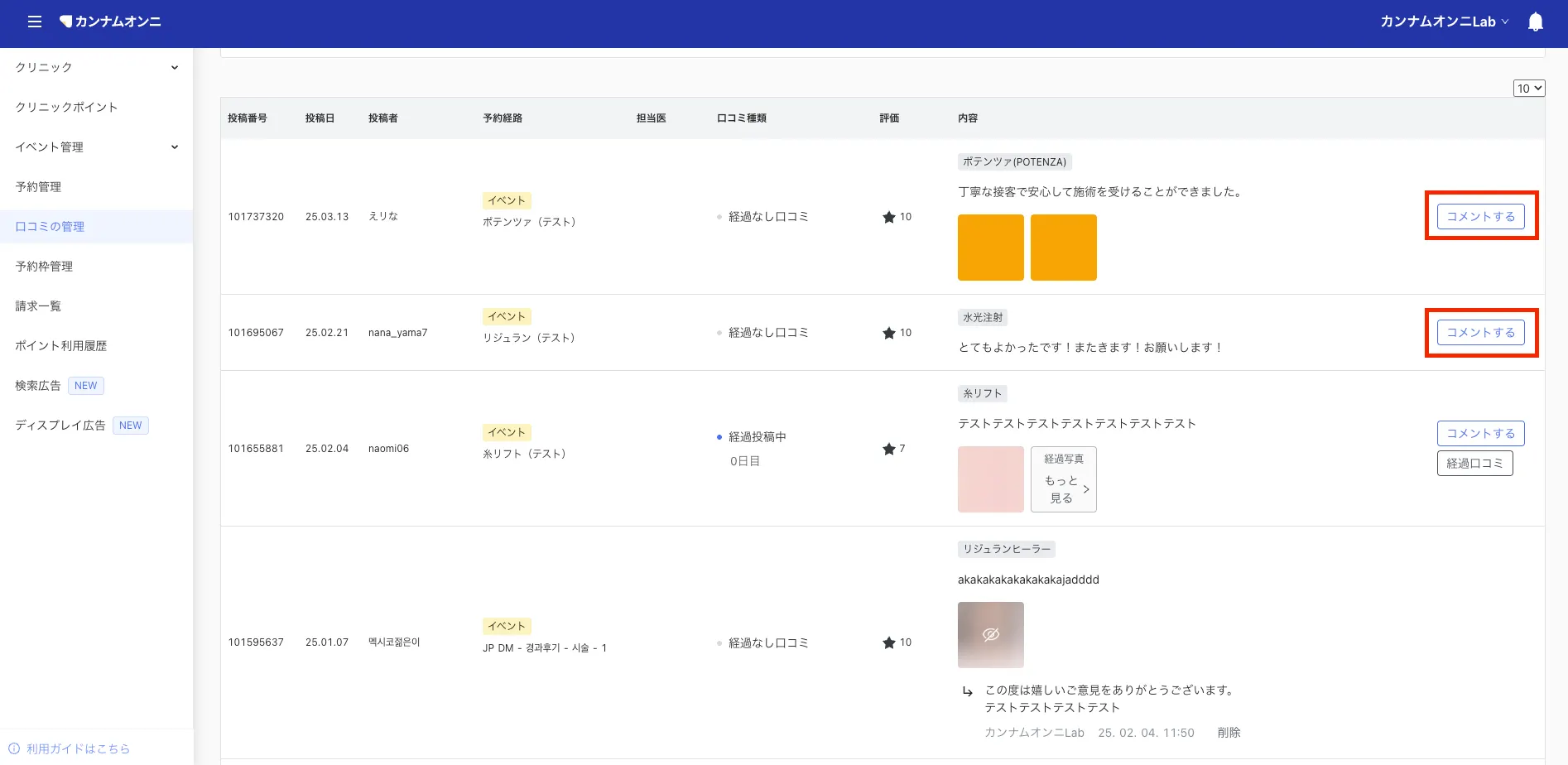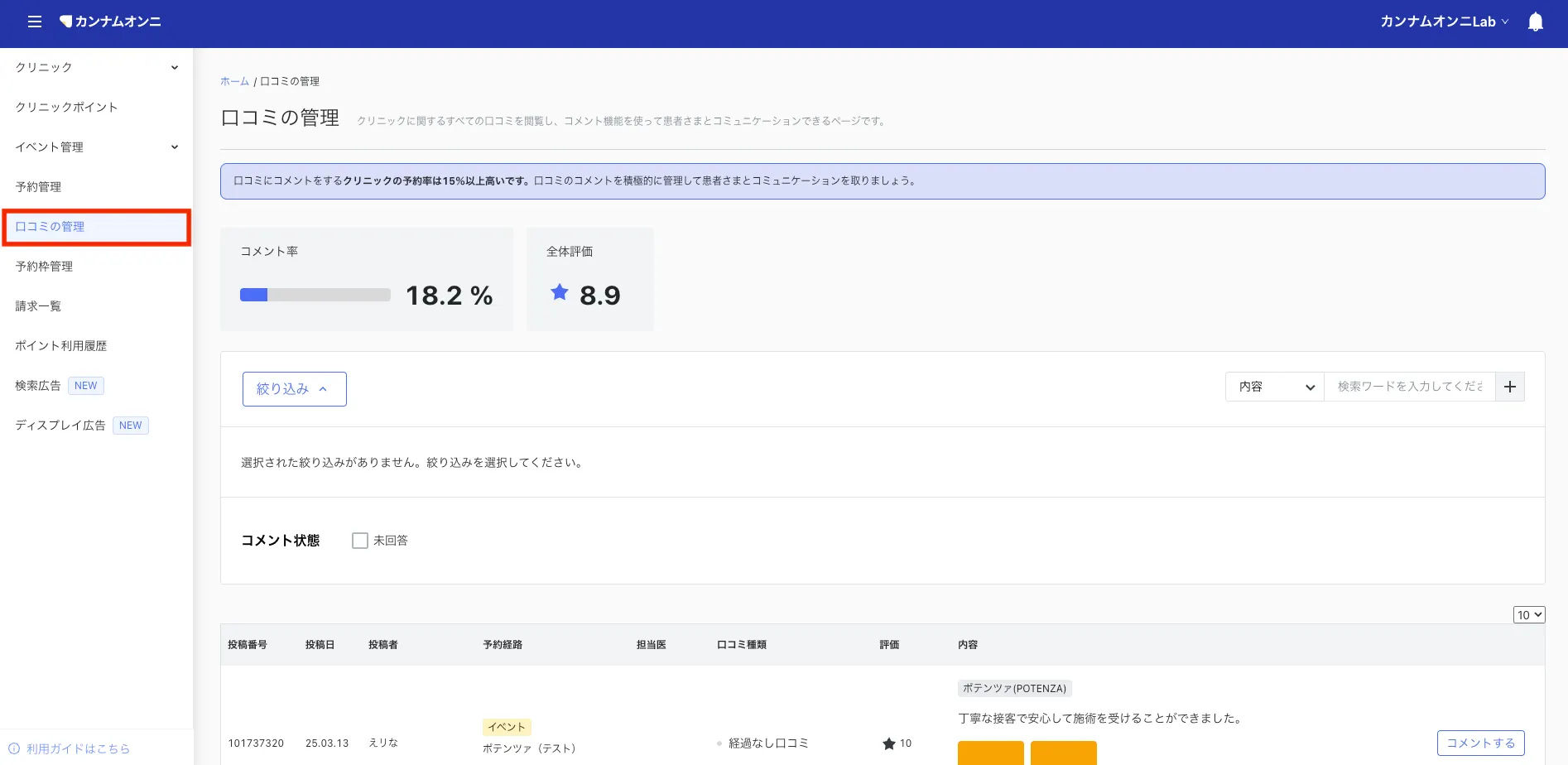 口コミは管理画面の「口コミの管理」から確認ができます。
