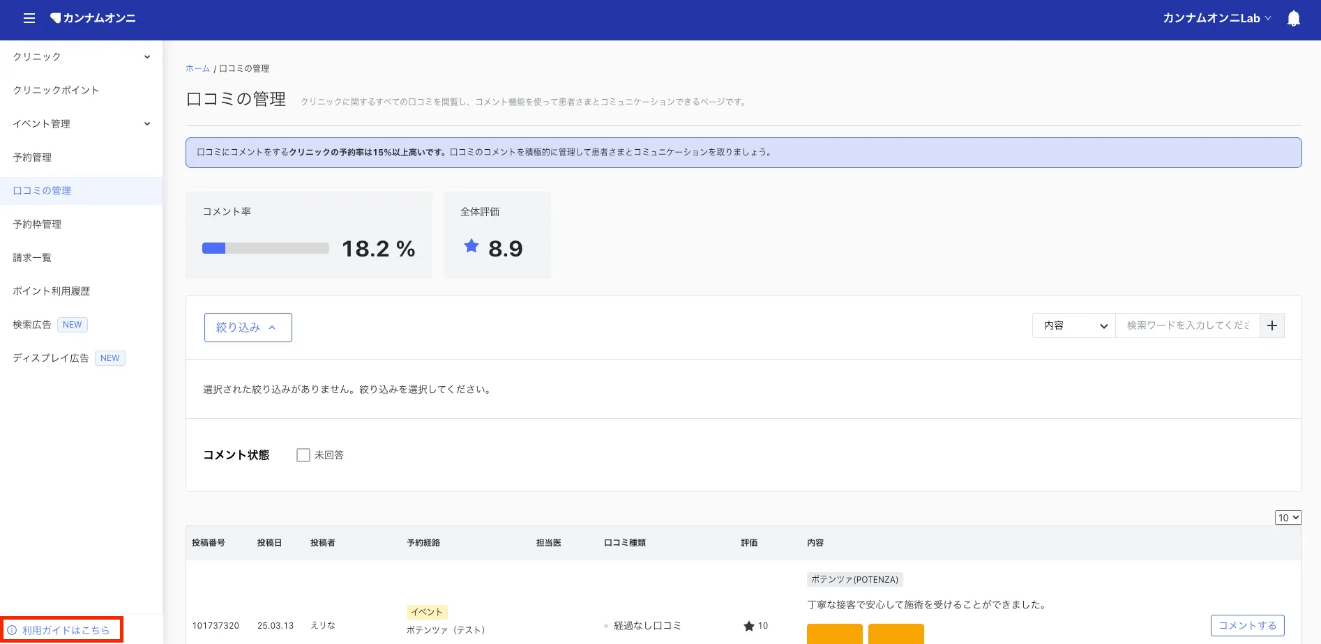 カンナムオンニの管理画面の利用ガイドは、クリニック管理画面の左下に設置しております。もしご不明点がございましたら、どうぞご確認いただけますようお願いいたします。