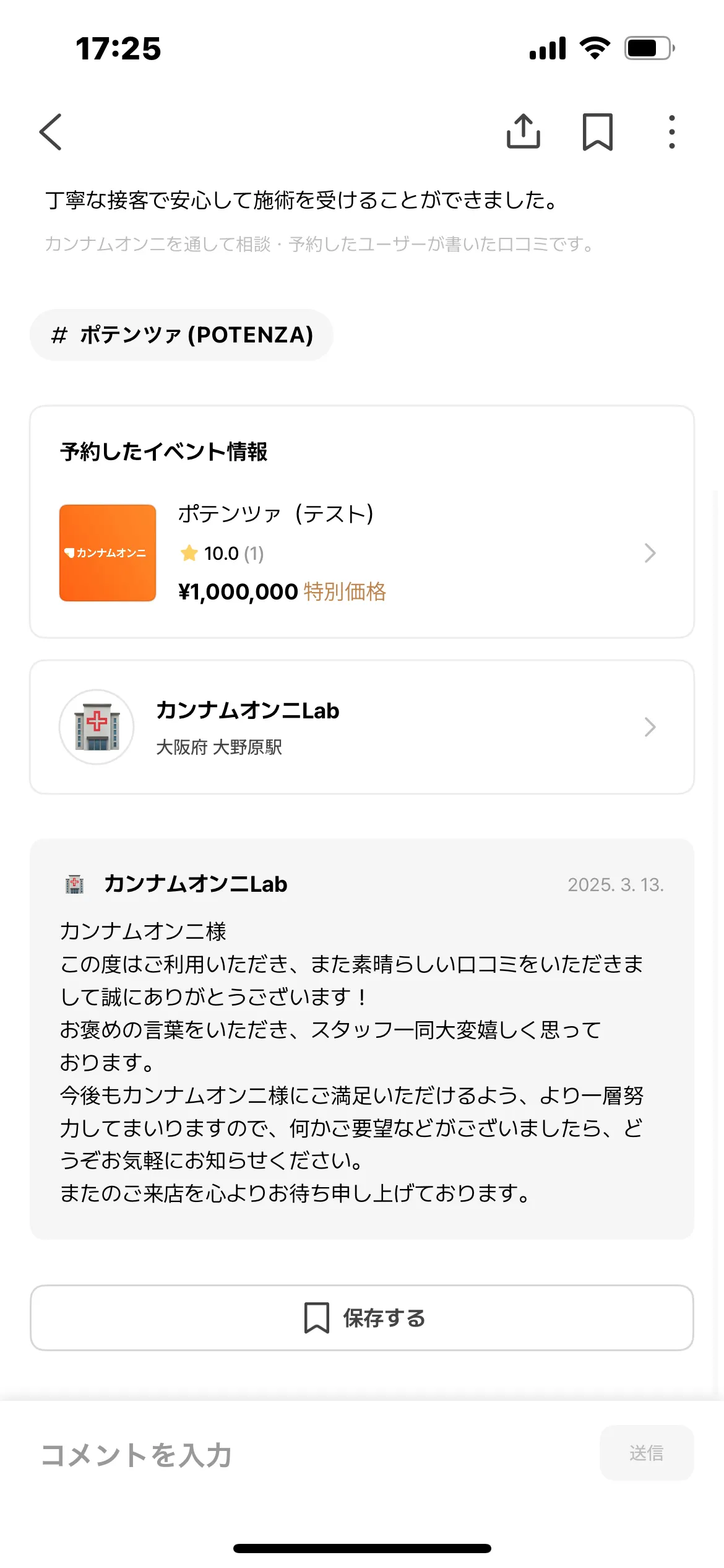 口コミへの返信は、口コミの下に表示されます。予約を検討されているユーザーの方々もご覧いただいていますので、できるだけ返信をしていただけますと大変効果的です。