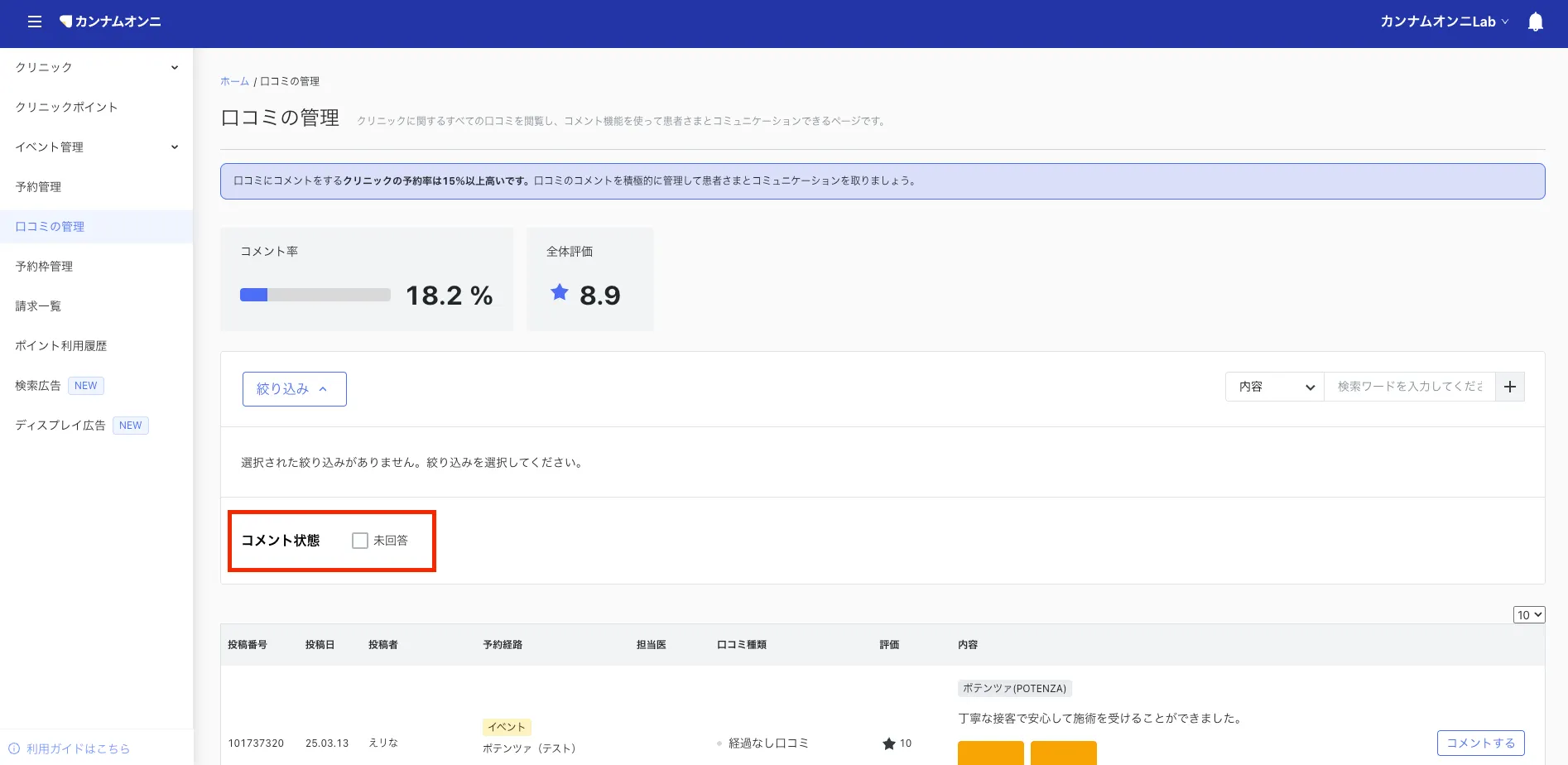 「未回答」フィルターを使用することで、未回答の口コミのみを絞り込んで表示することができます。