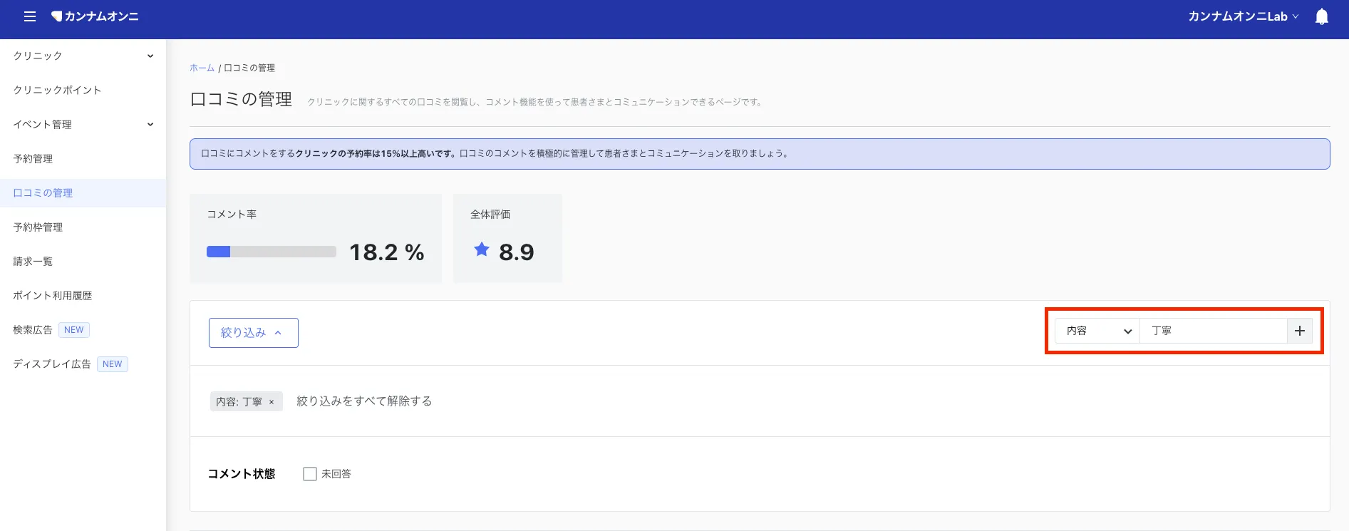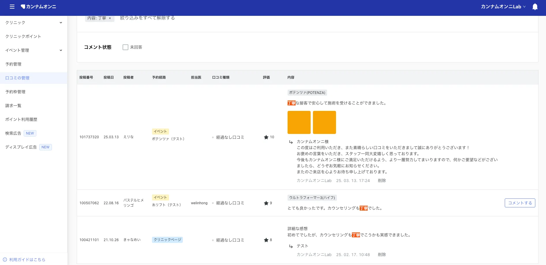 管理画面右側の検索窓にお好きなワードを入力していただくと、該当する口コミのみが表示されます。ぜひこちらの機能を活用してください。