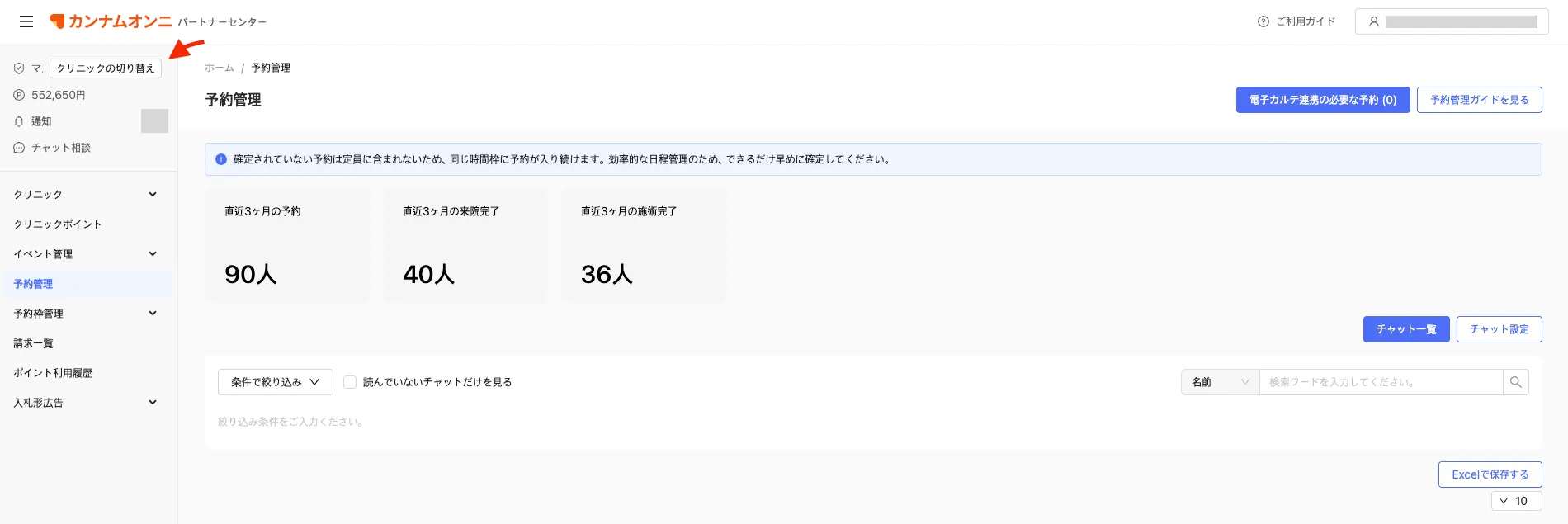 クリニックの切り替え方法がわからない場合は、画面左上の『クリニックの切り替え』より操作いただけます。