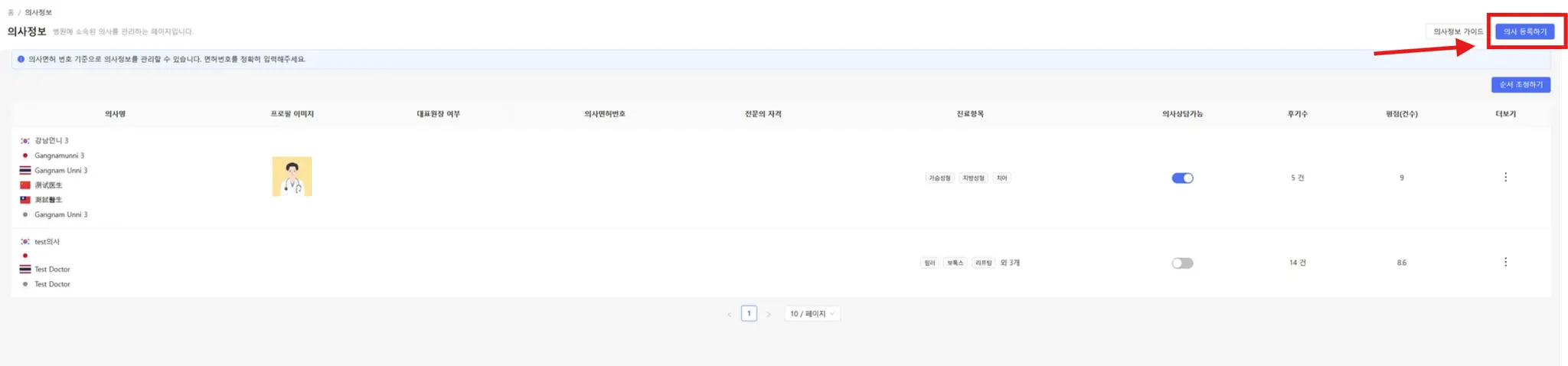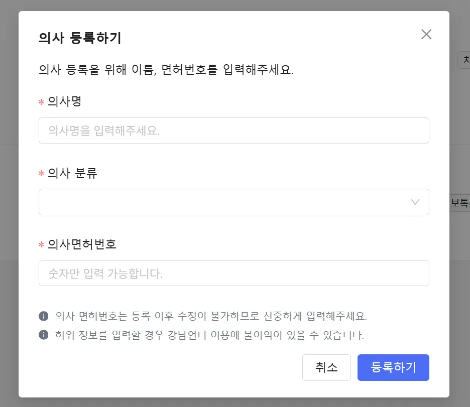의사명/의사 분류/ 의사면허번호 입력한 뒤 등록하기 클릭
