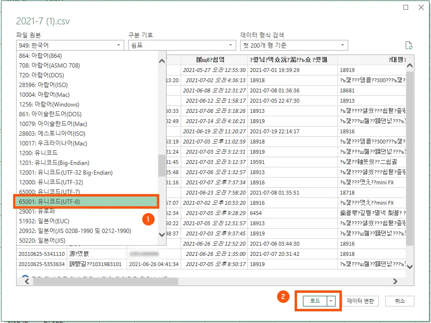 파일형식을 949: 한국어 에서 65001: 유니코드(UTF-8)로 변경하여 선택 후 파일을 로드합니다.