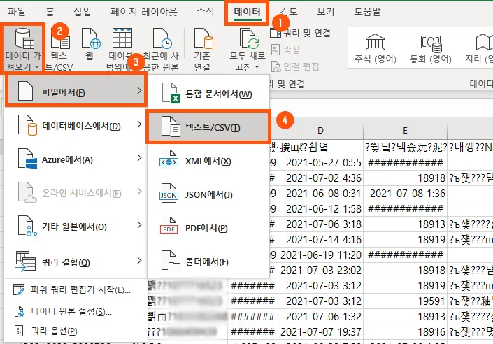 메뉴의 데이터>데이터가져오기>텍스트/CSV를 선택합니다.