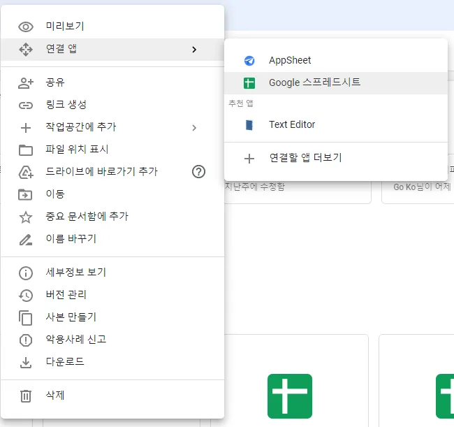 해당 파일을 우클릭>연결앱>google 스프레드 시트를 선택합니다.