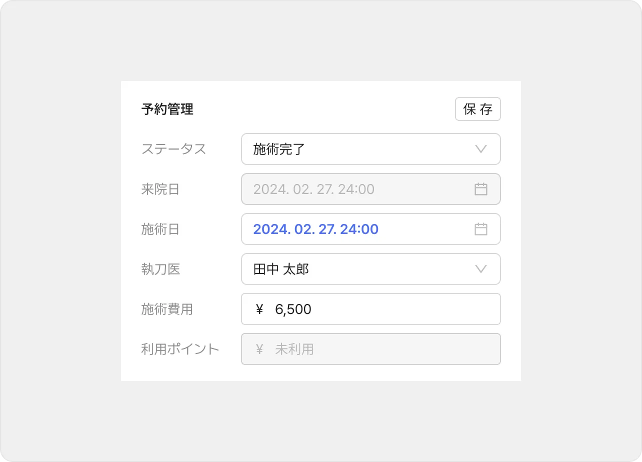 ステータス 施術完了 に変更し、施術日、執刀医、施術費用を入力してください。