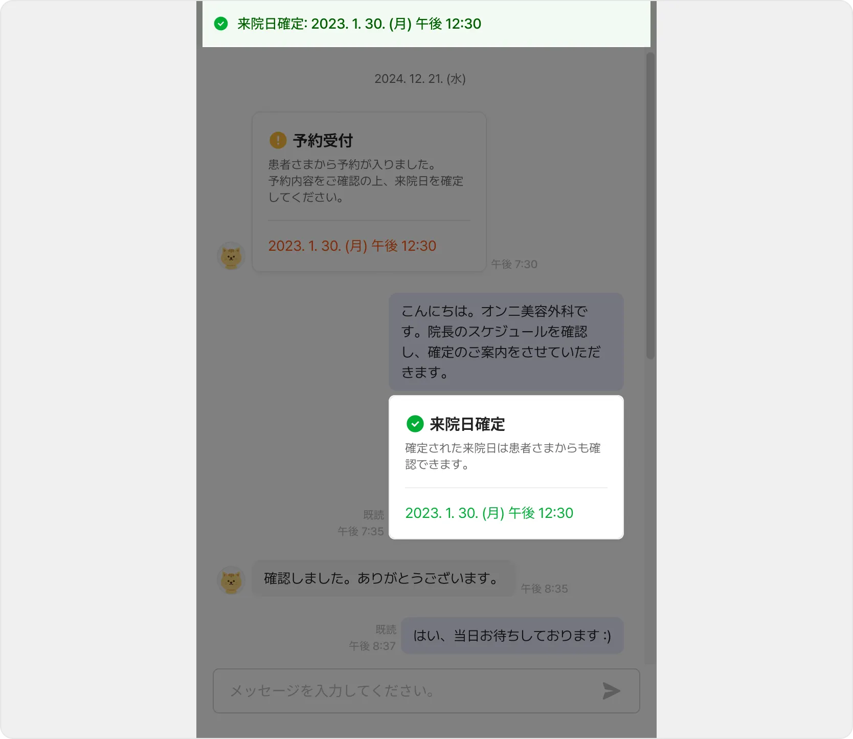 3) 来院日を保存すると、来院日確定のお知らせメッセージが自動的に送信されます。お客様はチャットルームで来院日が確定したことを確認できます。
