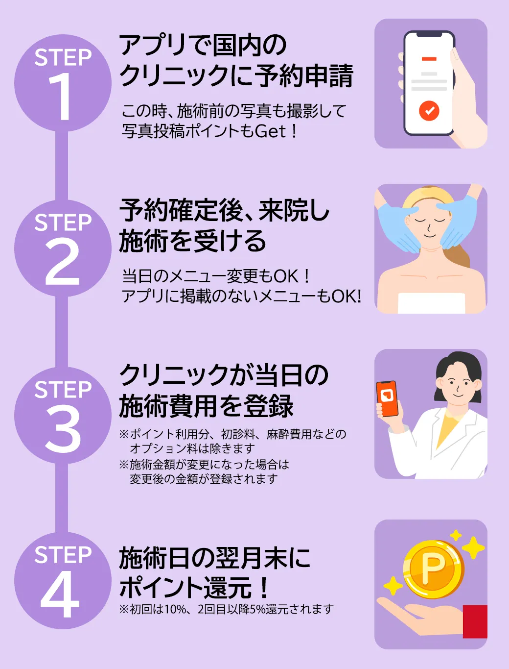 ※ 施術費用から消費税、初診料、再診料、麻酔代などのオプション料、物販、ポイント利用分を差し引いた金額がポイント付与対象となります。