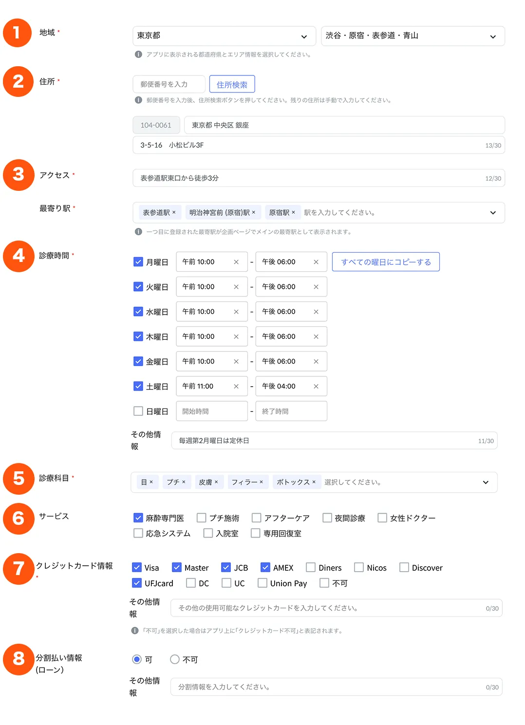 ⑥ サービス: クリニックの提供サービスを選択して追加できます。