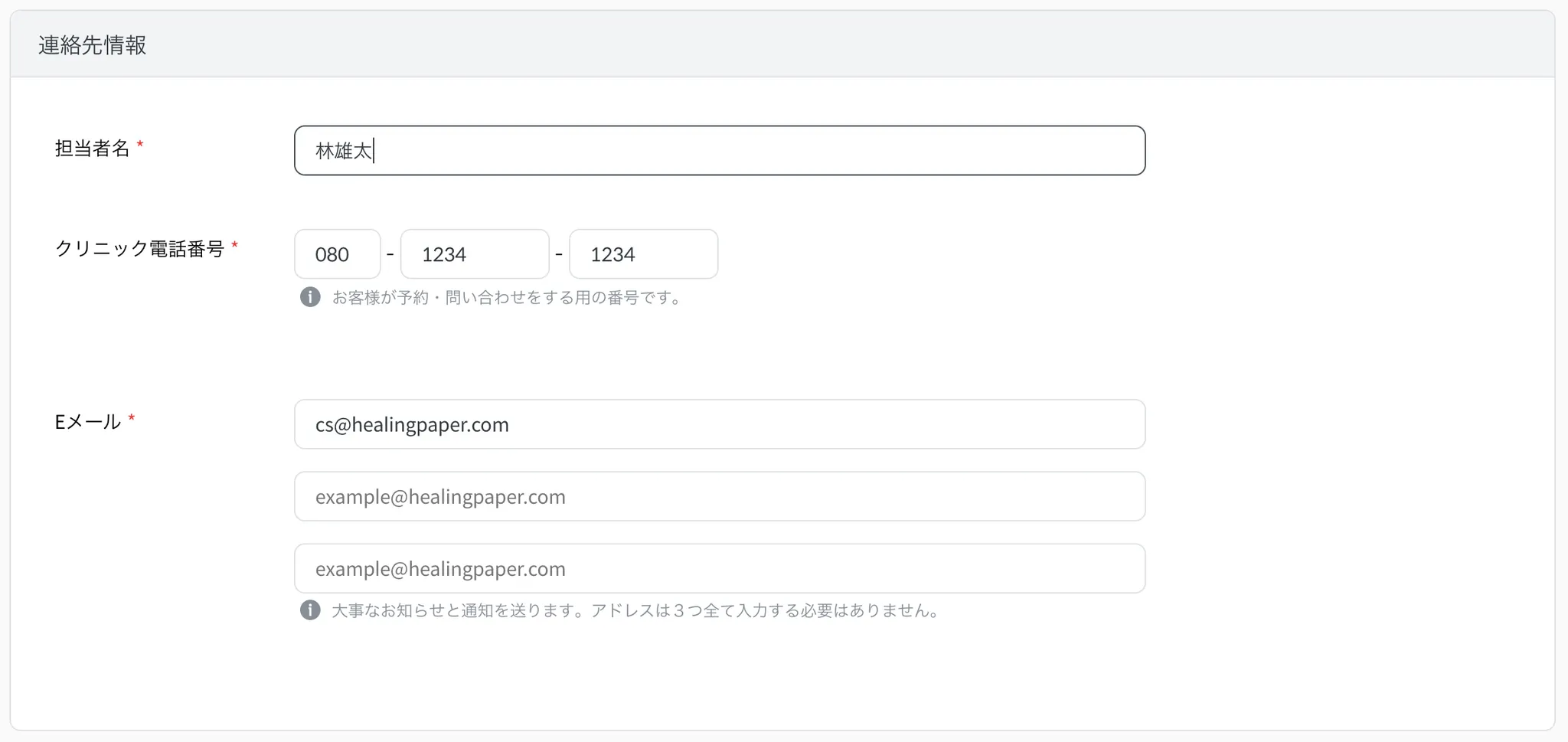 ③ 院長: チェックをつけるとドクター名の隣に院長 と表示されます。したがって、ドクター名 に院長 であることを追加で記入する必要はなく、名前のみご記入ください。(記入する場合、「院長」が二度表示されることになります)