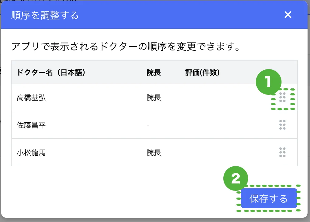 ② 順序を調整する: アプリで表示されるドクターリストの順番を変更します。右のボタンをドラッグすると並び替えできます。