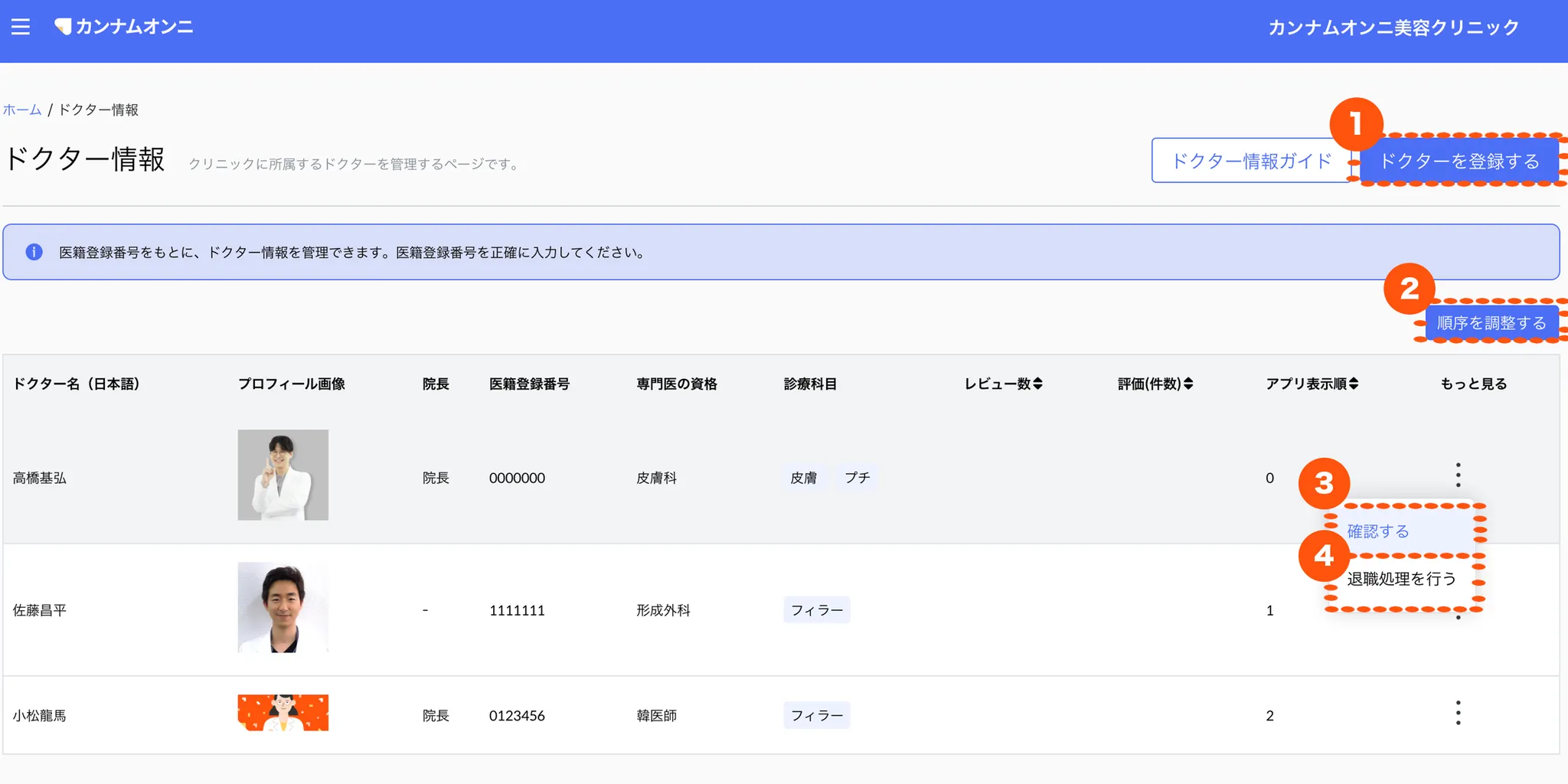 ③ 確認する: 登録されたドクターの情報を修正するページに移動します。