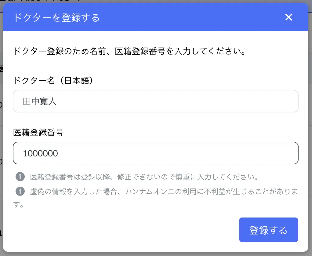 ドクター名と医籍登録番号: ドクター名と医籍登録番号を入力してください。