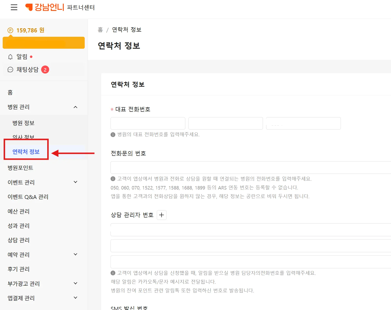강남언니 연락 수신 담당자 연락처 등록은 어디서 하나요?