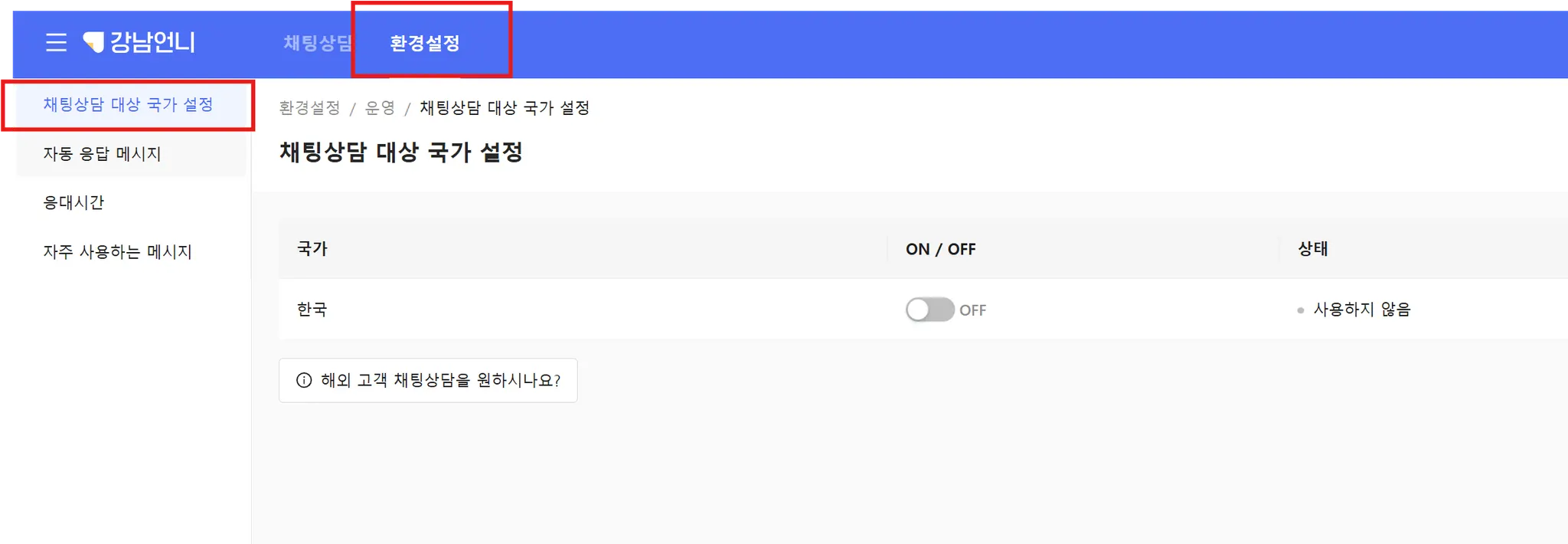 2. 채팅상담>환경설정>채팅상담 대상 국가 설정에서 ON/OFF 처리가 가능합니다.