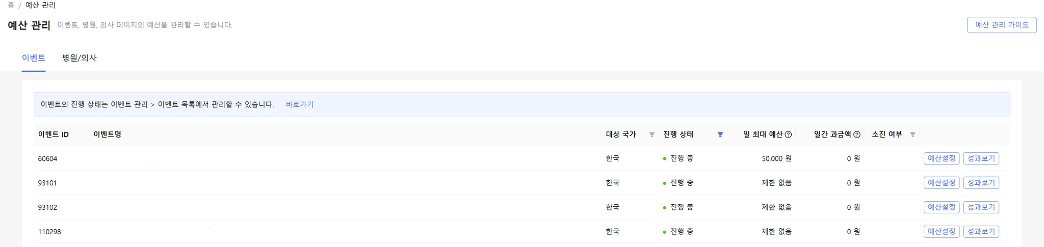 대상 국가 : 이벤트가 노출되는 국가가 표시됩니다.