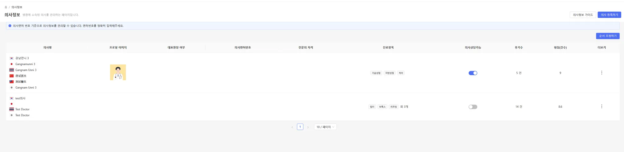 대표원장 여부 : 의사의 대표원장 여부를 설정할 수 있으며, 해당 정보는 앱에 노출됩니다.