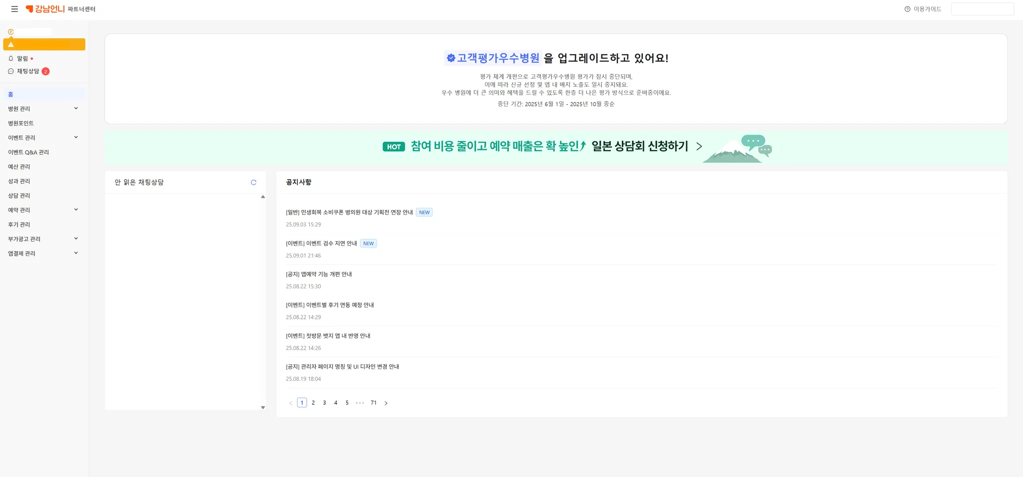 공지사항 : 병원향 공지사항을 확인할 수 있으며 최신순으로 노출됩니다.