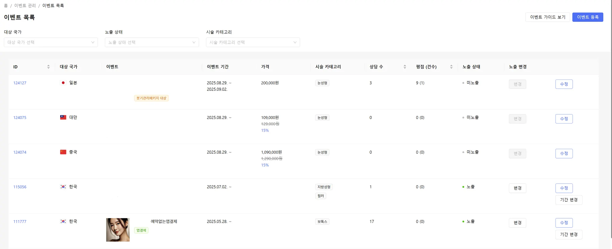 노출 상태 : 이벤트의 노출 상태가 노출 혹은 미노출로 표시됩니다.