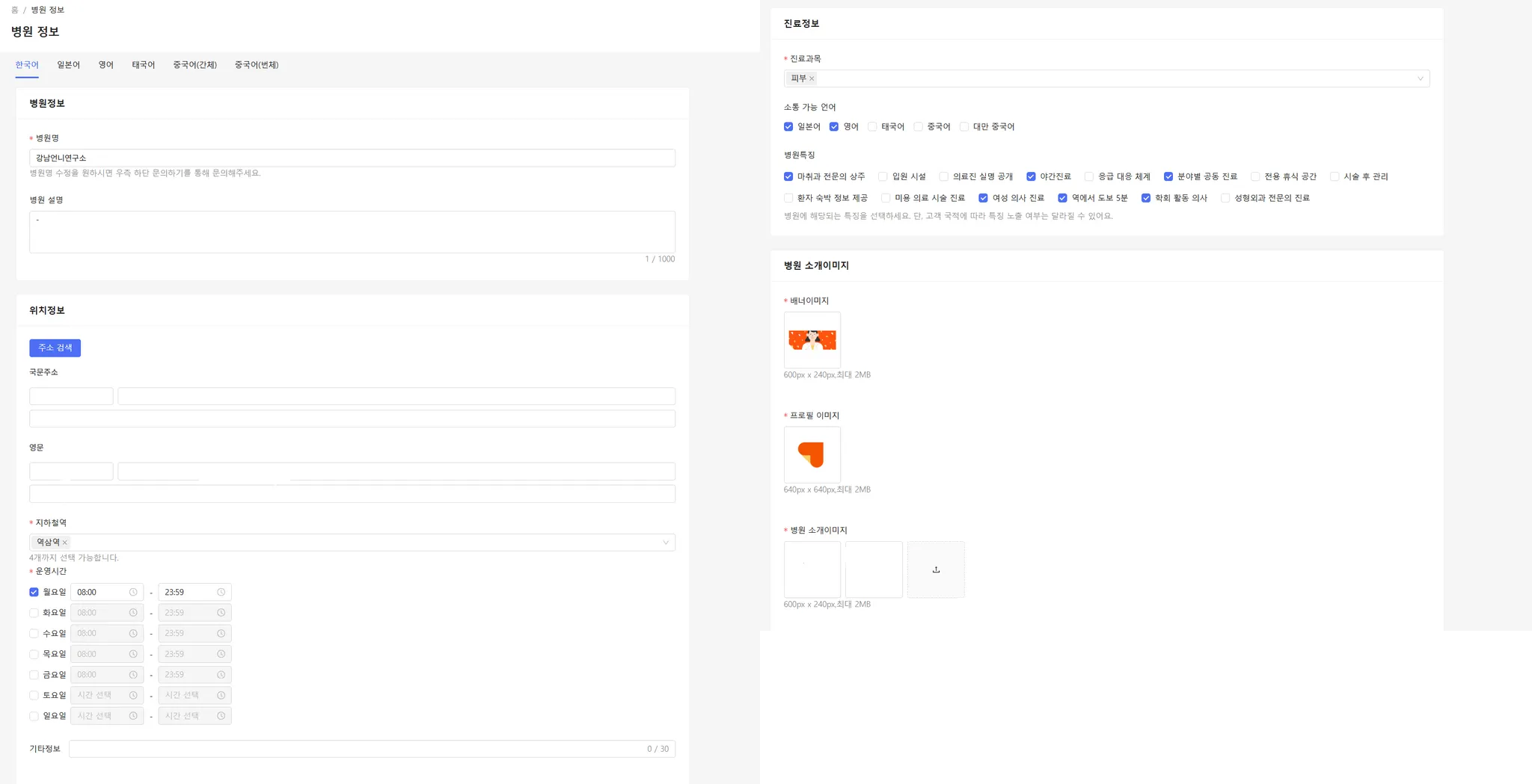 운영시간 : 병원의 운영 시간을 '월요일~일요일' 순으로 입력할 수 있습니다.