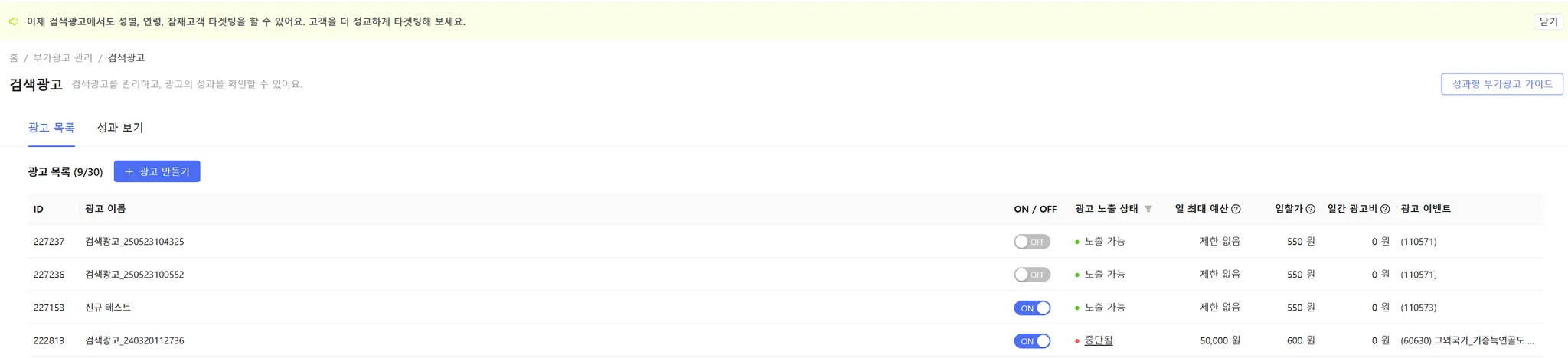 부가광고 관리 탭 들어갔을 때 보이는 화면