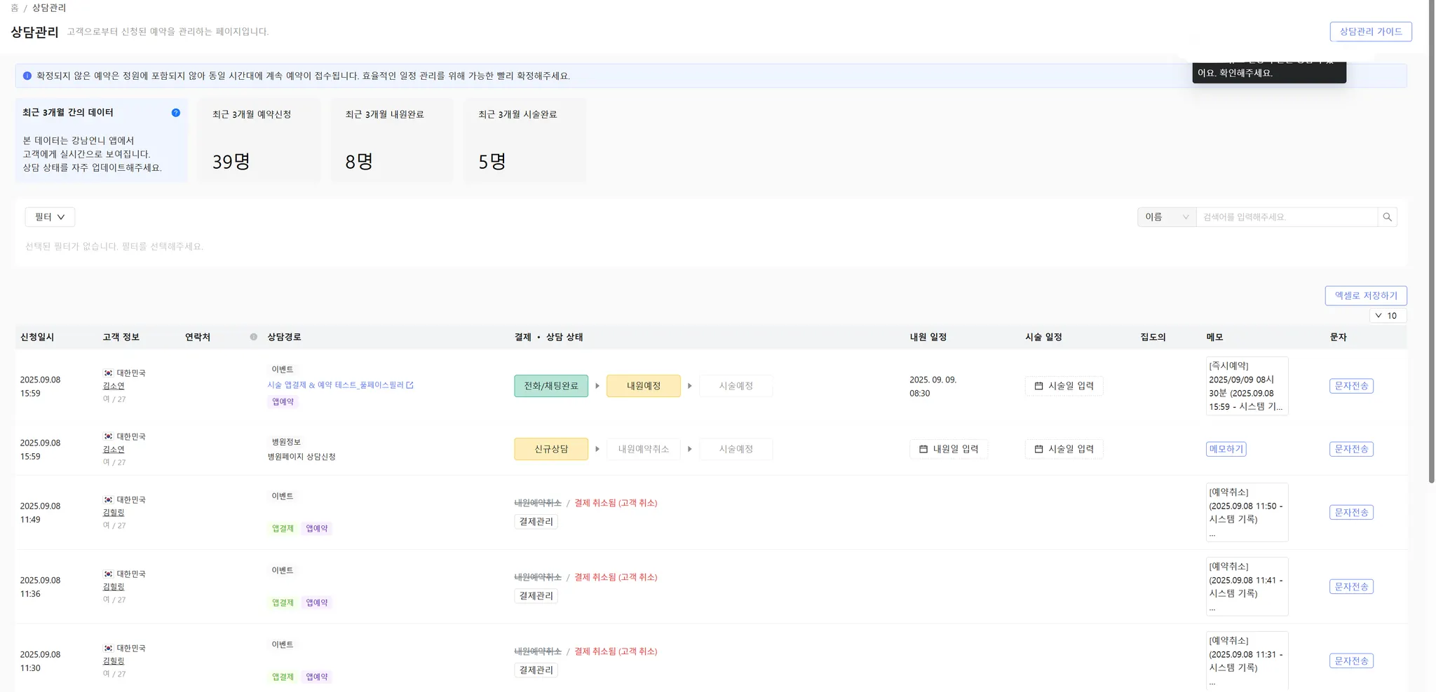신청일시 : 상담 신청이 유입된 날짜와 시간을 확인할 수 있습니다.