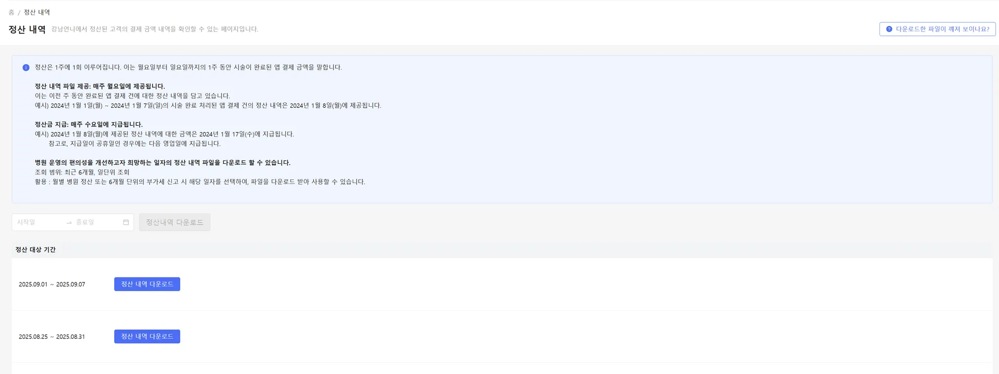 정산 파일 : 정산 단위 익일 생성 (시술 완료 처리주의 차주 월요일)