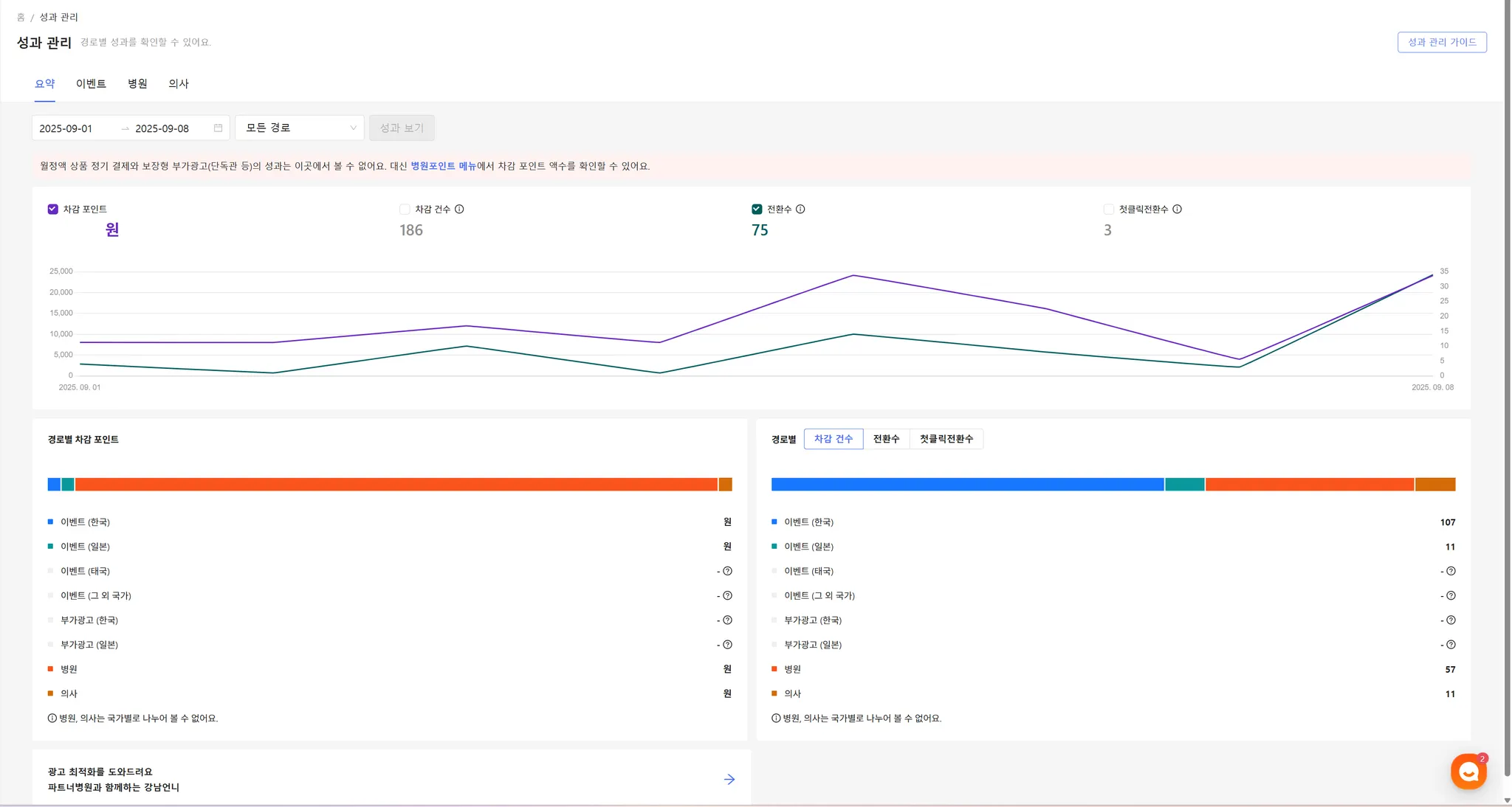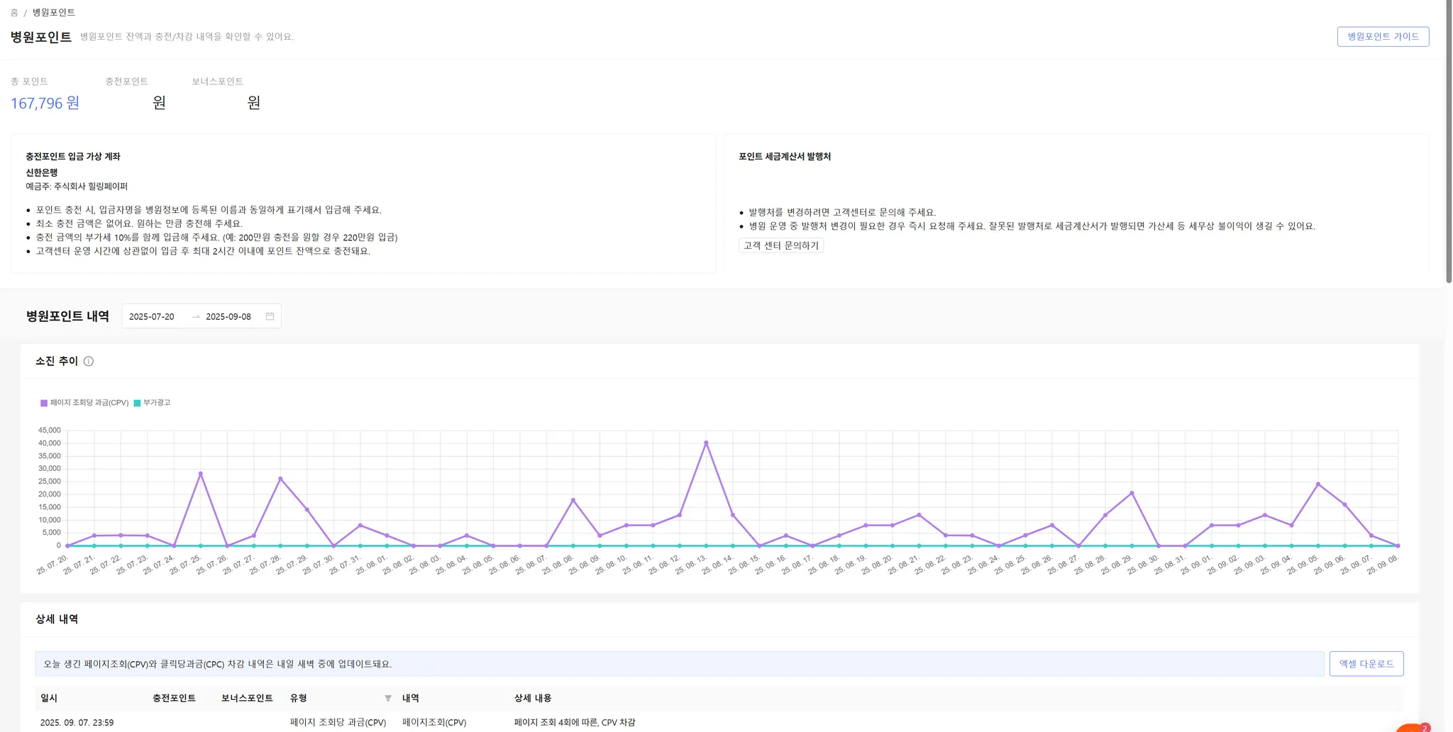 설정된 기간 내 병원포인트의 소진 추이가 그래프로 표시됩니다.