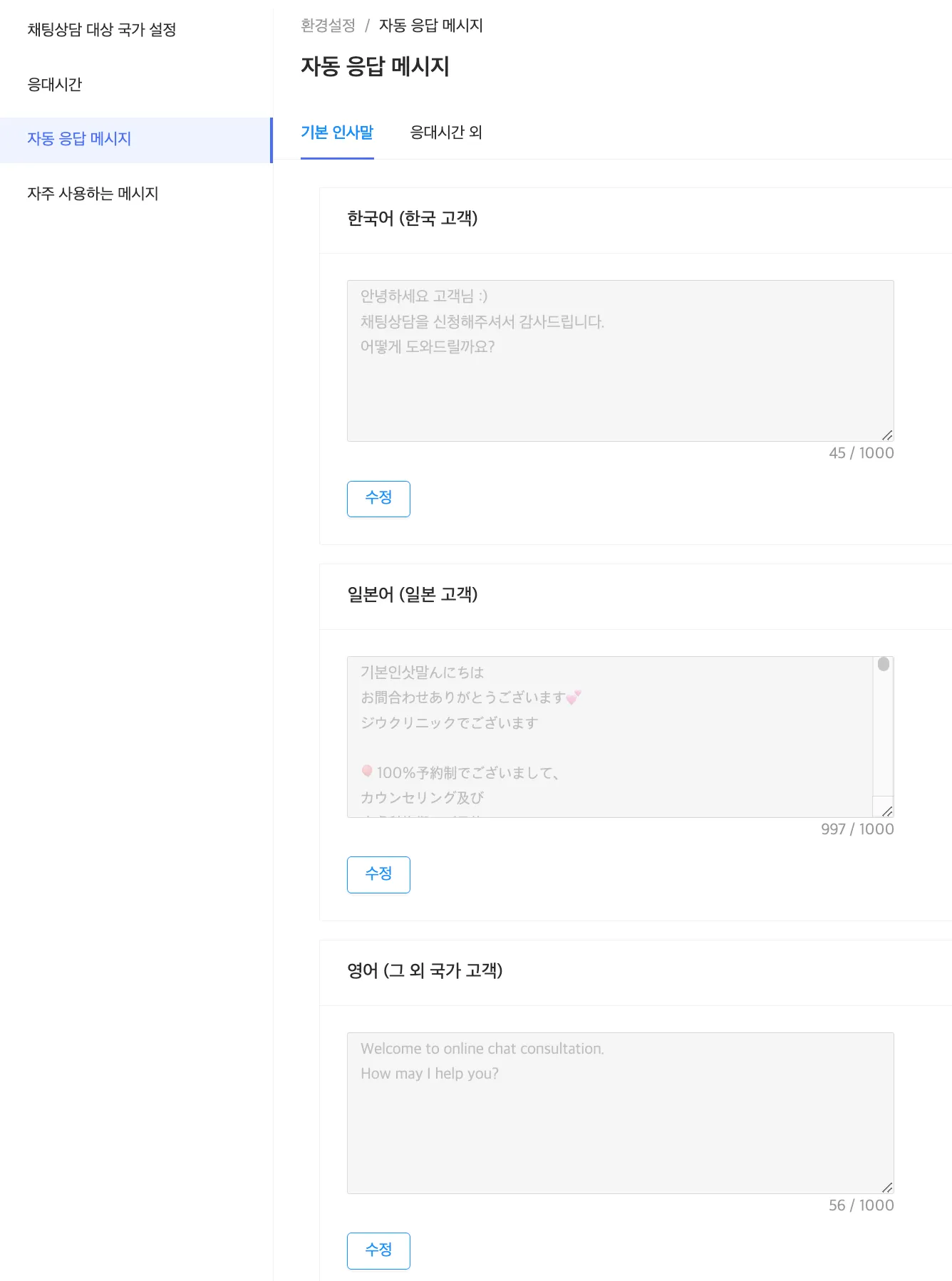 자동 응답 메시지 : 기본 인사말과 응대시간 외 자동 응답 메시지를 한국어/일본/영어로 설정할 수 있습니다.