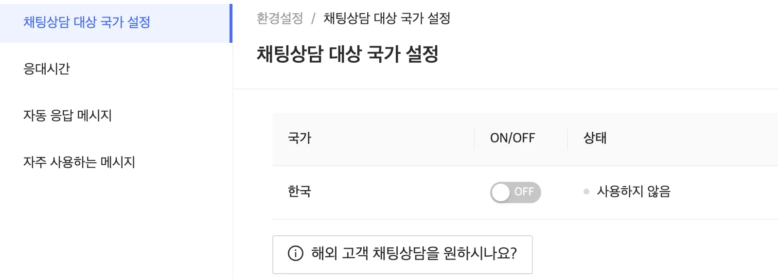 채팅상담 대상 국가 설정 : 채팅상담이 가능한 국가를 설정합니다.