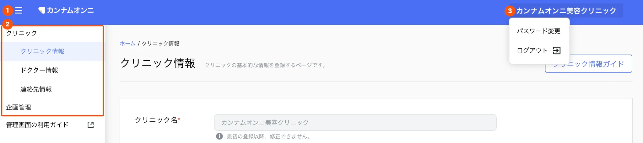 ③ クリニック名をクリックするとパスワード変更とログアウトボタンがあります。