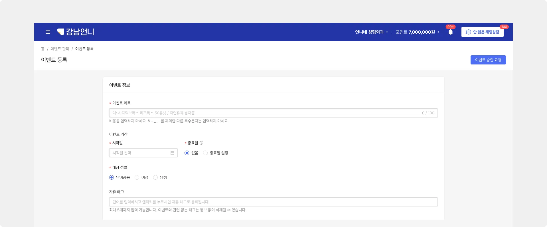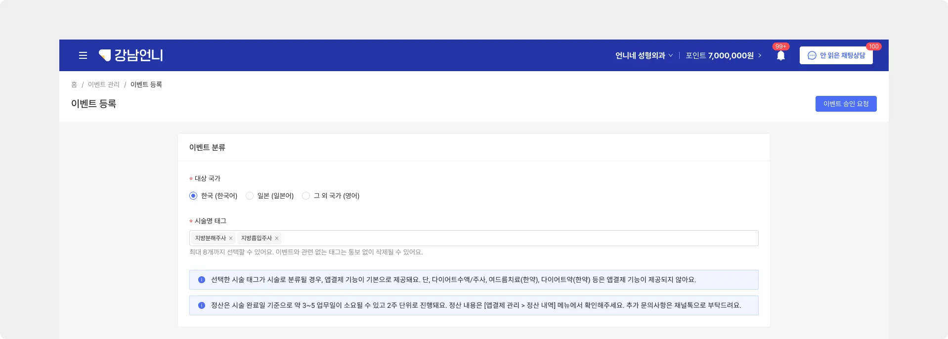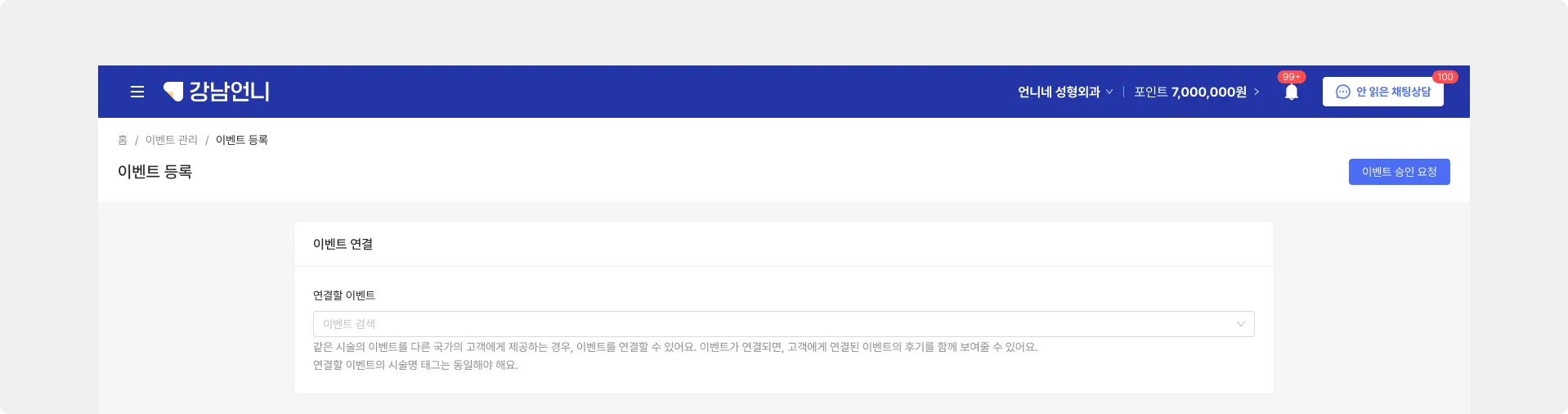 [이벤트 승인 요청] 버튼을 클릭하면 강남언니 이벤트 검수팀에 내용이 전달돼요.
